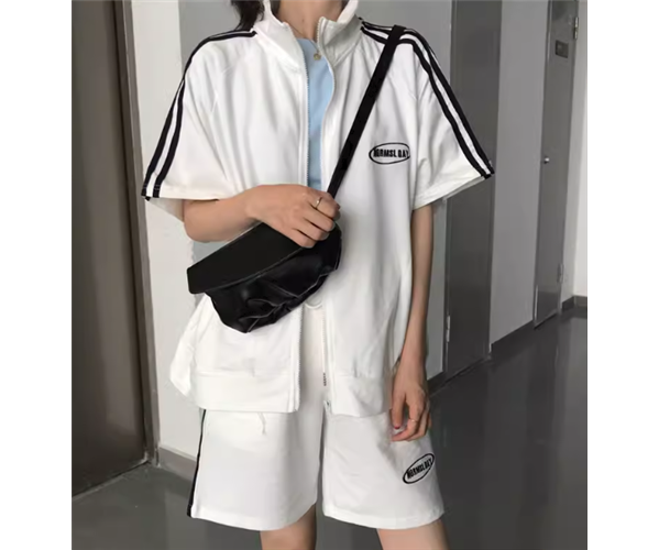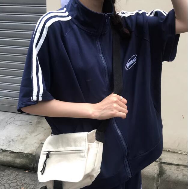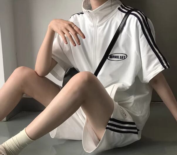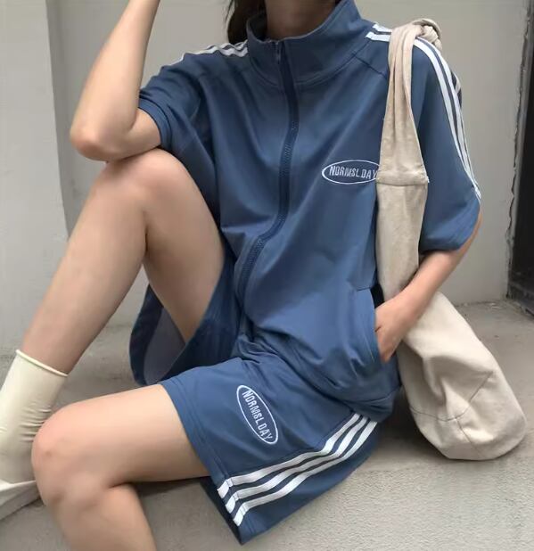 二点セット 上下セット ツーピース レディース ジャージ セットアップ スポーツウェア ハーフパンツ ショートパンツ 半袖 ファスナー ポケット シンプル カジュアル おしゃれ かっこいい レトロ ラフ メンズライク ボーイッシュ スポーティー ルーズ クール アクティブ 爽やか ハンサム シック スタイリッシュ 夏 10代 学生 部活 休日 スポーツ ランニング 普段使い 着回し M L XL ゆったり ホワイト ブルー ネイビー