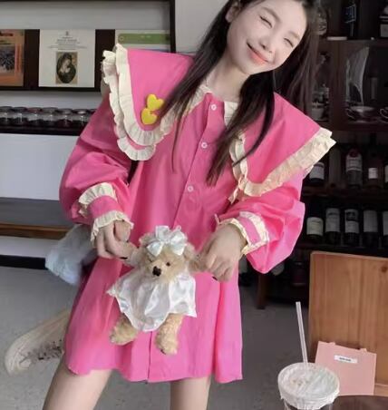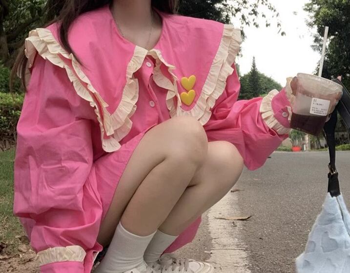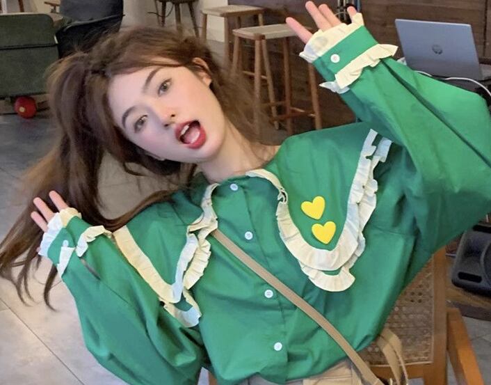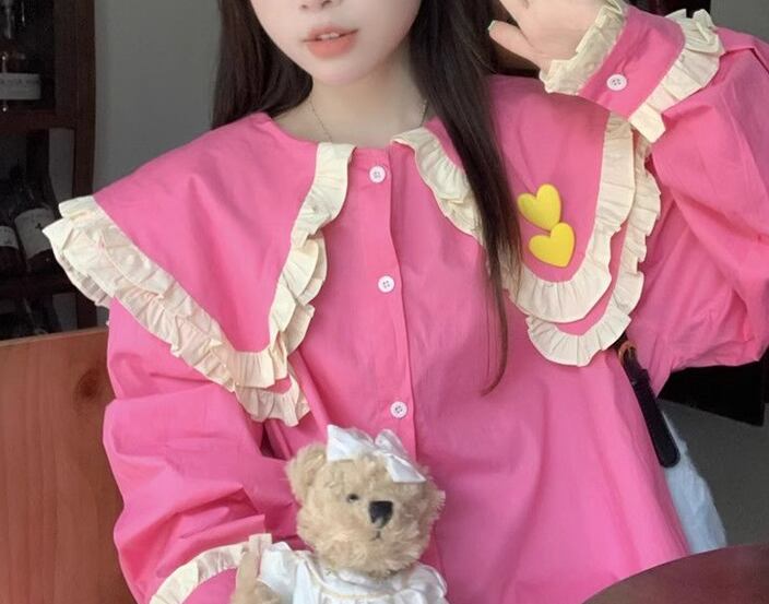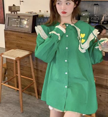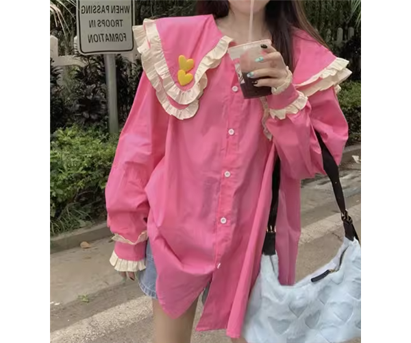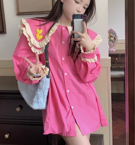 レディース トップス シャツ ミドル丈 長袖 襟付き ビッグカラー フリル 前開き ボタン かわいい カジュアル おしゃれ ガーリー ルーズ 個性的 存在感 ラブリー キュート ラグジュアリー アクティブ 派手 ポップ ファンシー メルヘン 華やか 原宿ファッション 無地 春 秋 10代 学生 デート お出かけ 体型カバー 普段使い 着回し S M L ゆったり ピンク グリーン
