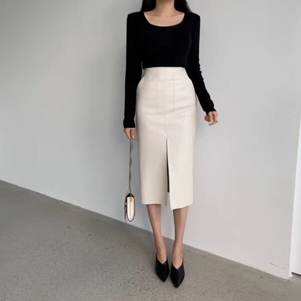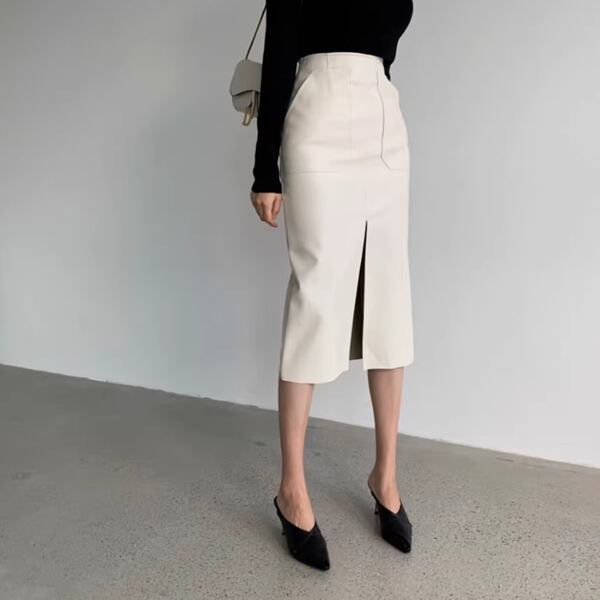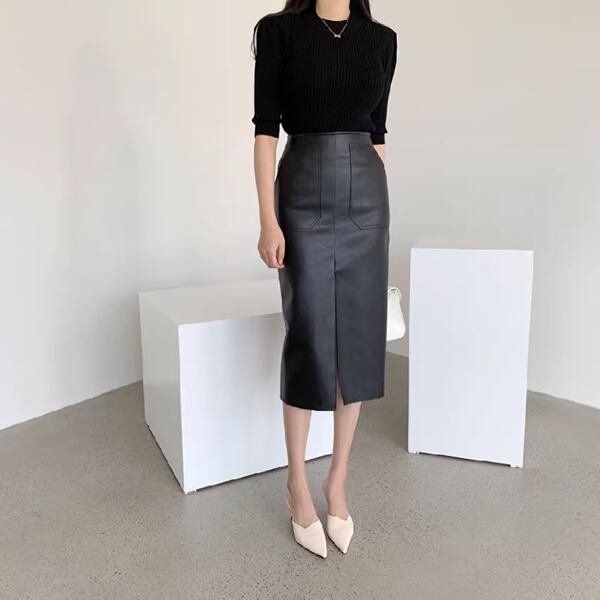 全3色 レディース スカート レザースカート タイトスカート ペンシルスカート ロングスカート 膝下 ミモレ ミドル丈 タイト スリム 細身 スマート フェミニン スリット ポケット ハイウエスト フェイクレザー PU 大人可愛い シンプル 上品 おしゃれ かっこいい クール エレガント フォーマル 知的 無地 シーズンレス 10代 20代 30代 オフィス 通勤 パーティー イベント レストラン ホテル コンサート