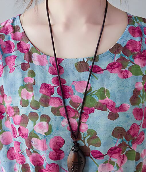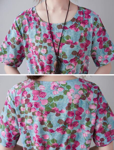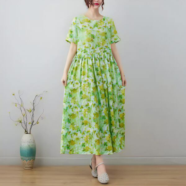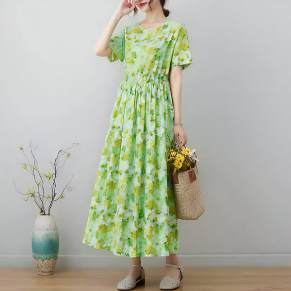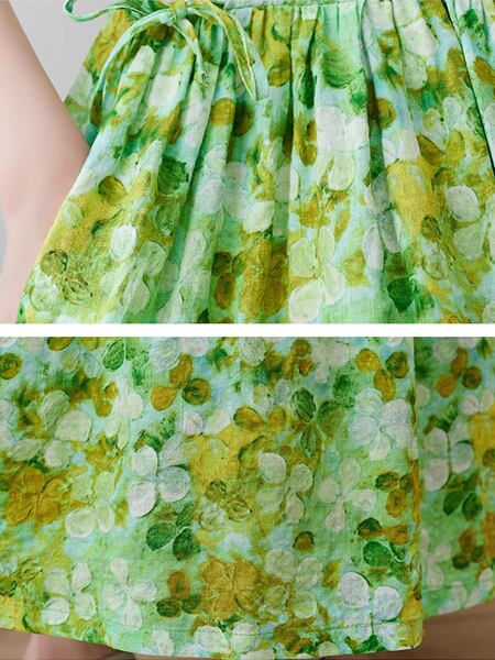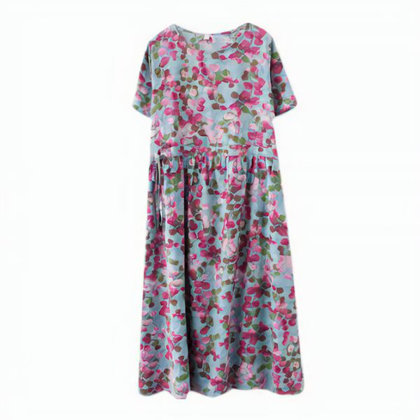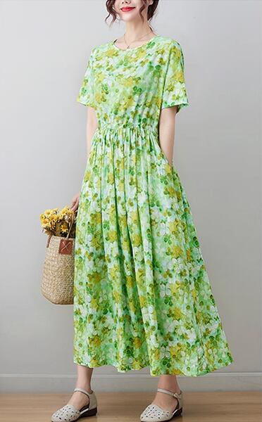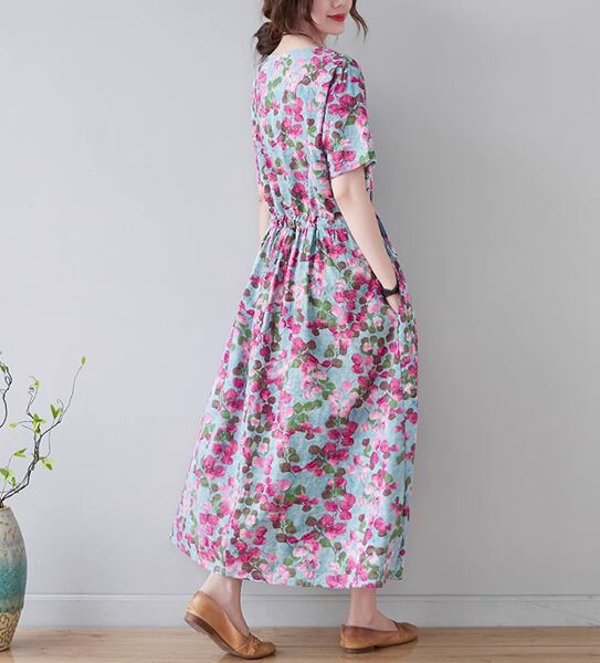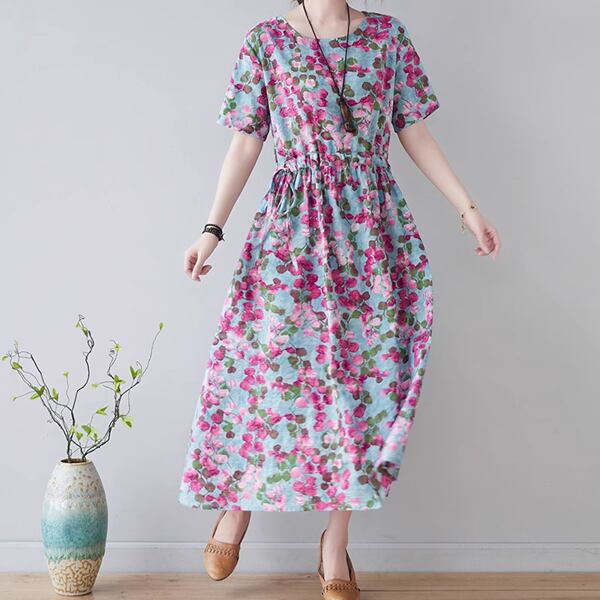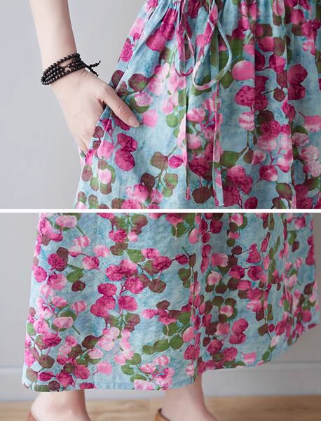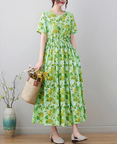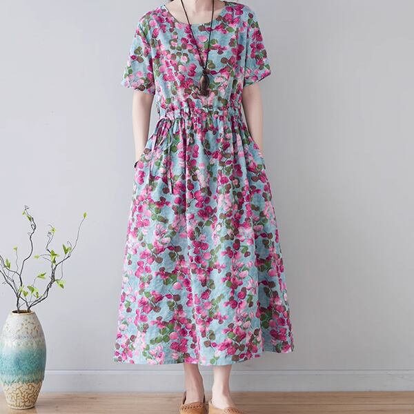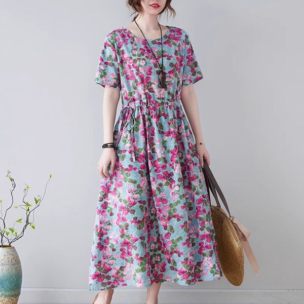 綿とリネンの素材が涼しく快適な着心地を提供する、夏にぴったりのドレスです。暑い季節でも快適に着用できる半袖デザイン。ロングスカートと、ウェスト部分のドローストリングがスタイルを美しく引き締めてくれます。プリントされた花柄が爽やか。おしゃれな夏の装いを演出する、一枚です。