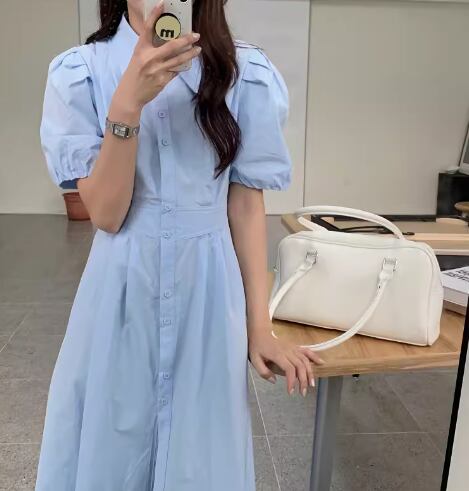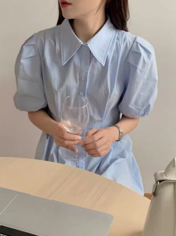 レディース ワンピース シャツワンピ 半袖 ボリューム袖 かわいい 大人可愛い きれいめ シンプル 上品 おしゃれ こなれ感 メンズライク マニッシュ ボーイッシュ クール モード系 エレガント 主役級 存在感 フォーマル ラブリー ナチュラル 無地 夏 韓国 オルチャン コーデ 清楚 トレンド インスタ映え 水色 ブルー