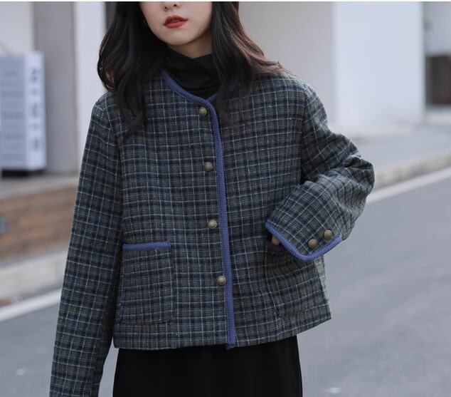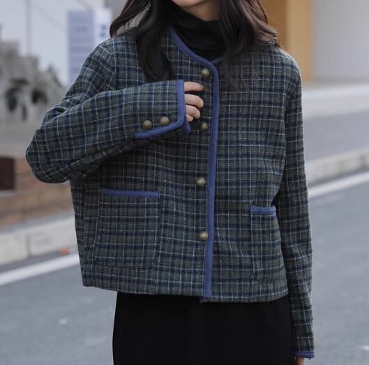 レディース コート アウター 上着 ショート 長袖 ラウンドネック 襟なし ノーカラー ストレート ポケット ボタン 大人可愛い きれいめ シンプル カジュアル 上品 おしゃれ かっこいい レトロ ボーイッシュ クール エレガント クラシカル ナチュラル 知的 ハンサム シック 高級感 スタイリッシュ チェック 秋 冬 デート お出かけ 普段使い 着回し 清楚 XS S M L 小さいサイズ ブラウン グリーン