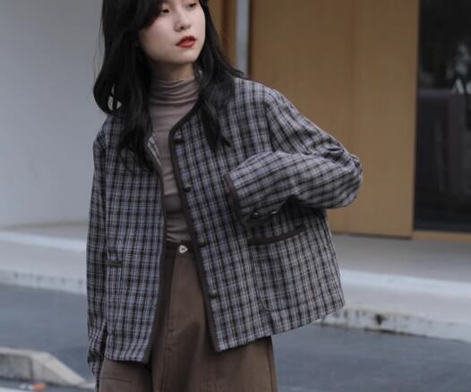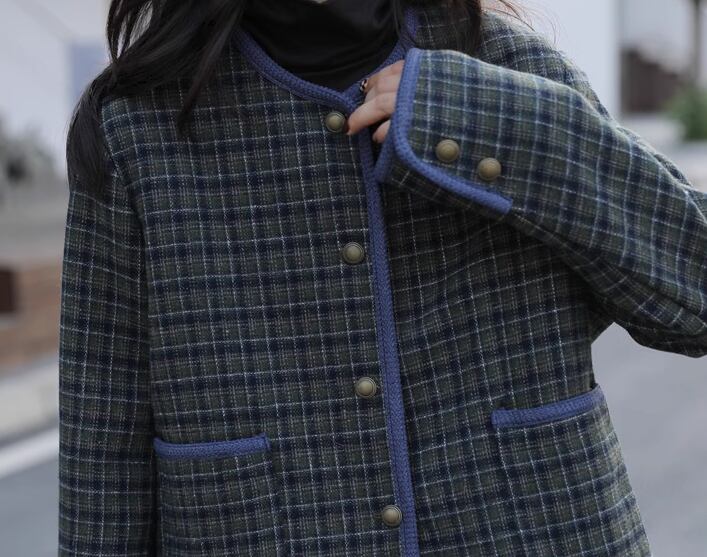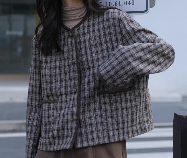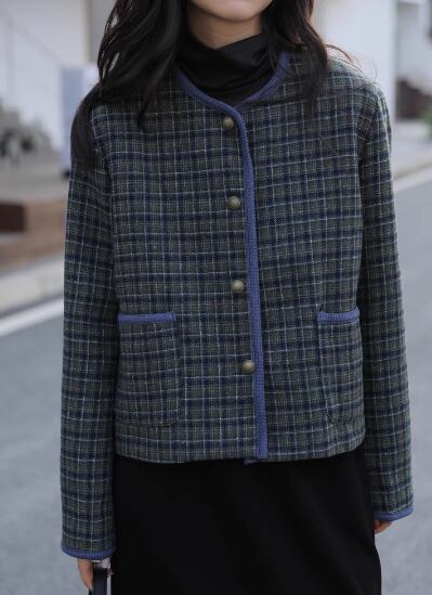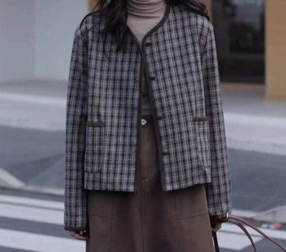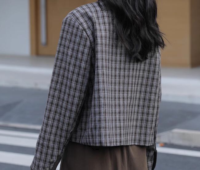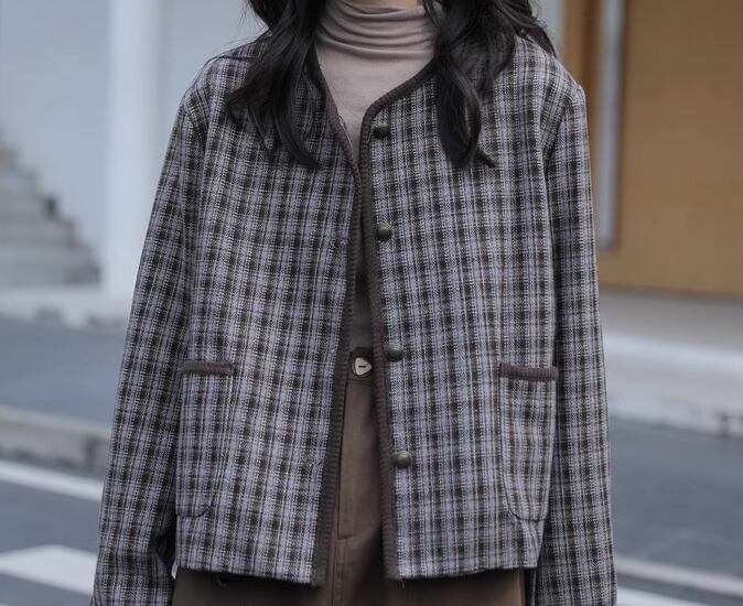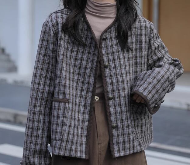 落ち着いた色味と大人可愛いチェック柄が魅力的なショート丈のノーカラーコート。