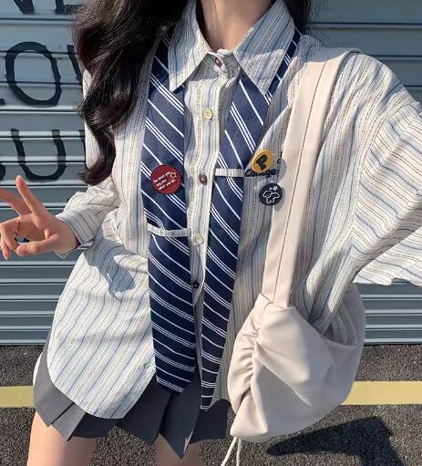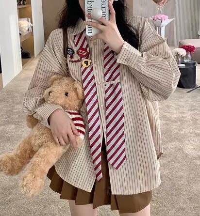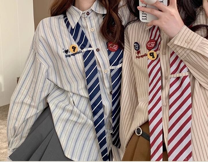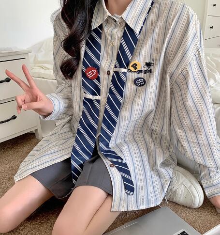 レディース トップス シャツ ミドル丈 長袖 襟付き ポロカラー ネクタイ 前開き ボタン かわいい カジュアル おしゃれ ガーリー ルーズ 個性的 存在感 ラブリー キュート ラグジュアリー カレッジ風 学生風 アクティブ シック 高級感 華やか スタイリッシュ ストライプ 春 10代 20代 学生 デート お出かけ 韓国 M L XL ゆったり ゆる 大きめ オーバーサイズ ブラウン ブルー