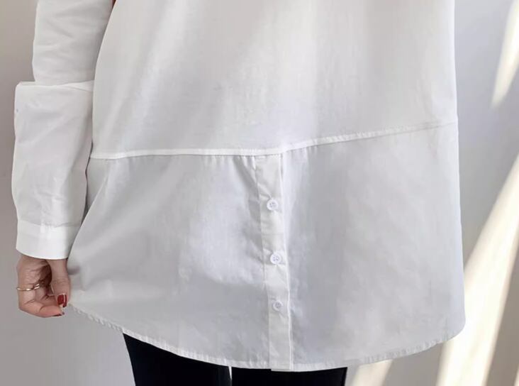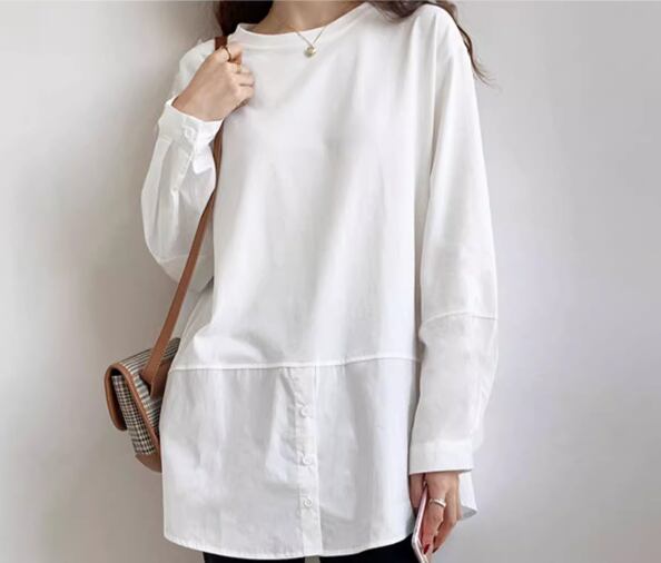 裾部分の切り替えデザインとシャツ風の袖がおしゃれな真っ白なロング丈Tシャツ。