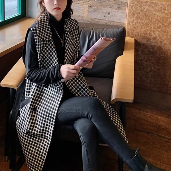 千鳥格子柄でスリムなシルエットのノースリーブベスト!ミッドレングスのウインドブレーカーとしても機能します。上着としてもチョッキとしても着用可能な2WAYデザインで、着こなしの幅が広がります。軽やかな着心地で、暖かさをキープしながらスタイルアップできる一着。おしゃれな印象を与えるベストで、春秋のお出かけを彩りましょう。