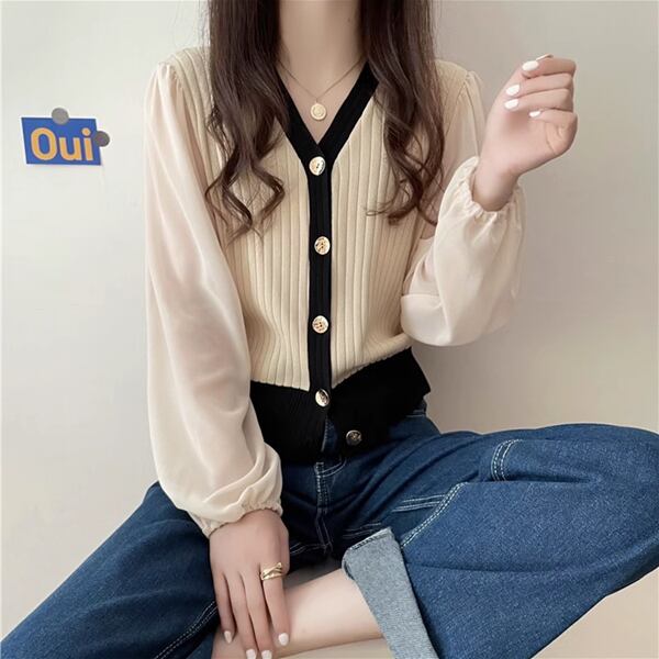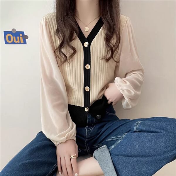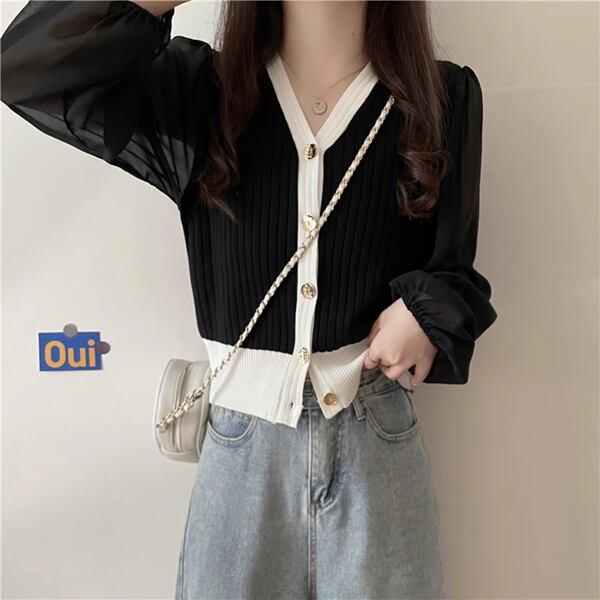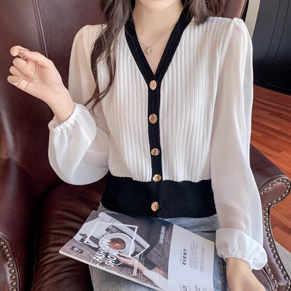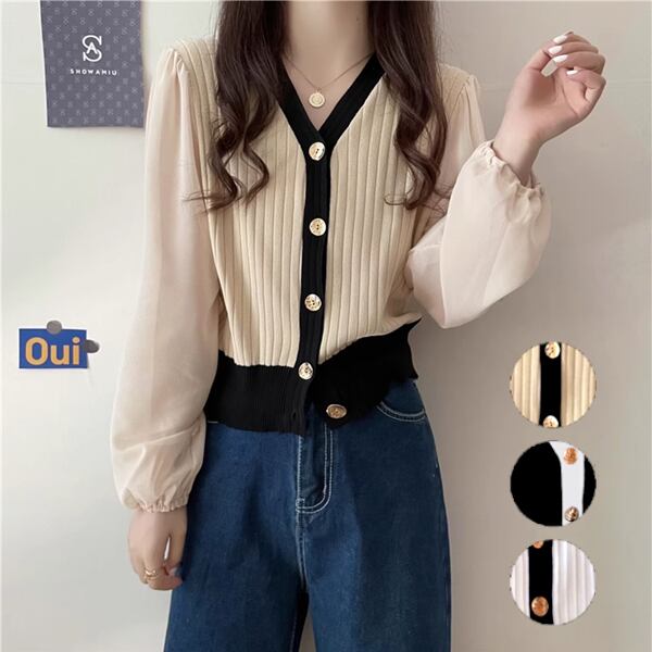 全3色 Vネック長袖セーターセーター/ボトムカーディガン レディース トップス シャツ ブラウス セーター カーディガン 上着 クロップド丈 ミドル丈 長袖 パフスリーブ Vネック ストレート シフォン 伸縮性 ボタン バイカラー スリムフィット かわいい 大人可愛い 上品 おしゃれ ガーリー エレガント フォーマル 知的 オフィスカジュアル 無地 春 秋 10代 20代 オフィス 通勤 イベント ショッピング コンパ ドライブ トレンド 大きいサイズ ゆったり フリーサイズ