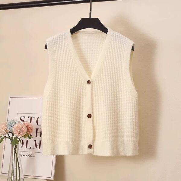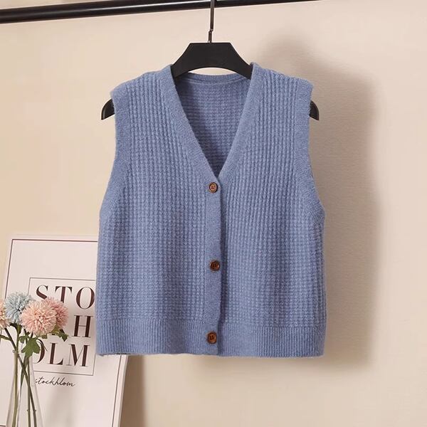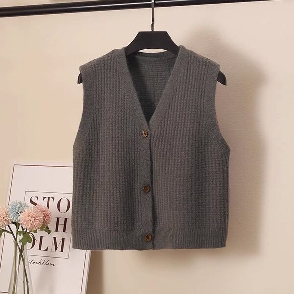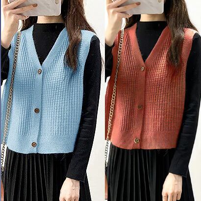 女性用ニットベストです。春と秋にぴったりのシングルブレストのチョッキで、ルーズなシルエットが特徴。Vネックのノースリーブセーター・カーディガンとしても着用でき、ニッチなトップとしても活躍します。ショート丈のデザインがスタイリッシュで、さまざまなコーディネートにマッチ。着心地も抜群です。おしゃれなアクセントになる一着です。