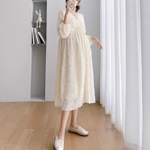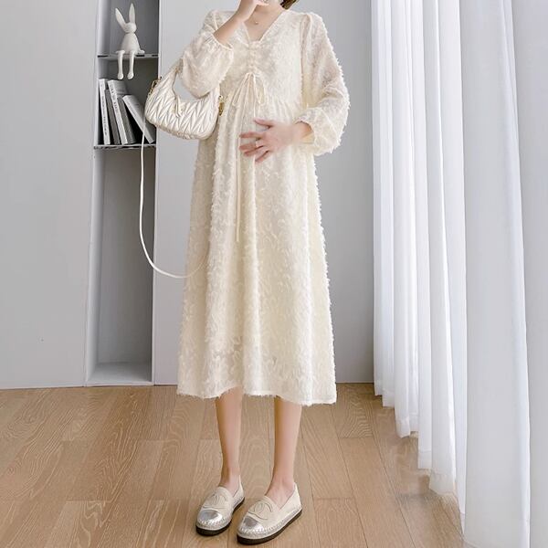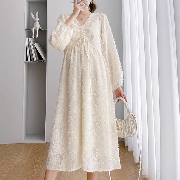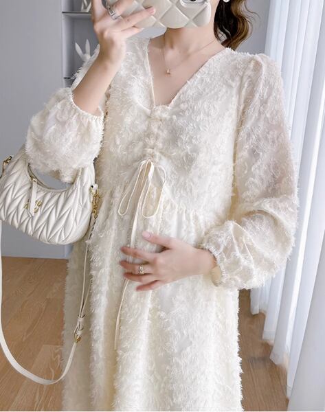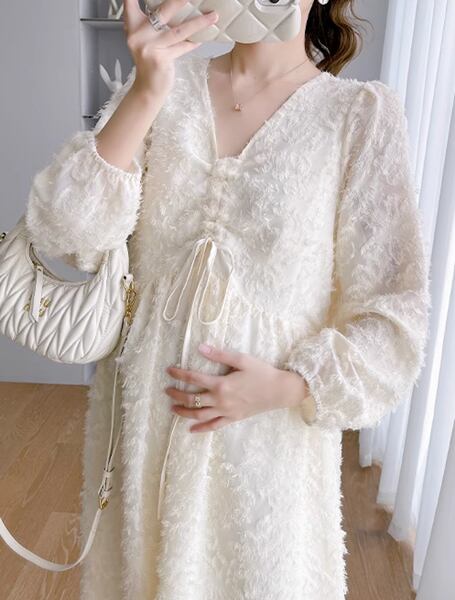 秋のマタニティスカート!ハイエンドなシフォン素材とジャカード柄がおしゃれなマタニティドレスです。長袖の巾着ドレスで、暖かさもバッチリ。スカートはミドル丈のAラインで、マタニティファッションを楽しむ、優雅なママのための一着です。また、ルーズなシルエットが快適で、大きいサイズの方にも対応しています。