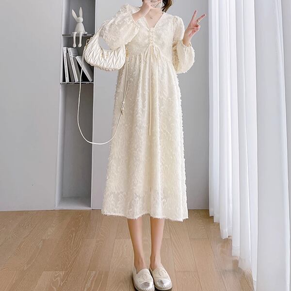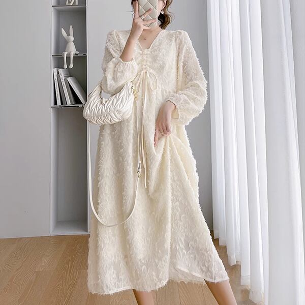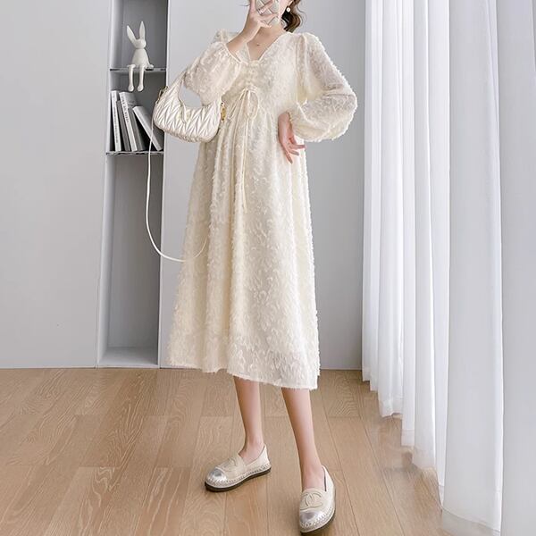 ドレス ワンピース ミモレ ミディアム丈 長袖 パフスリーブ Vネック Aライン シフォン レディース セミフレア オーバーサイズ ドロスト ジャカード 大人可愛い シンプル 上品 おしゃれ ルーズ フォーマル オフィスカジュアル 無地 春 秋 ママ マタニティ 20代 30代 オフィス 通勤 イベント レストラン ショッピング ドライブ 韓国 体型カバー 清楚 トレンド 動きやすい お腹カバー 大きいサイズ ゆったり オーバーサイズ アプリコット