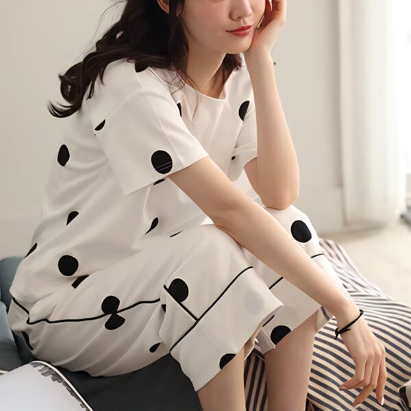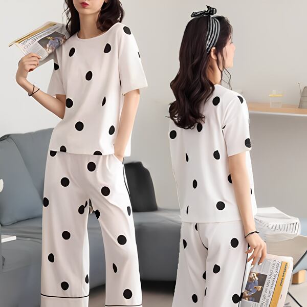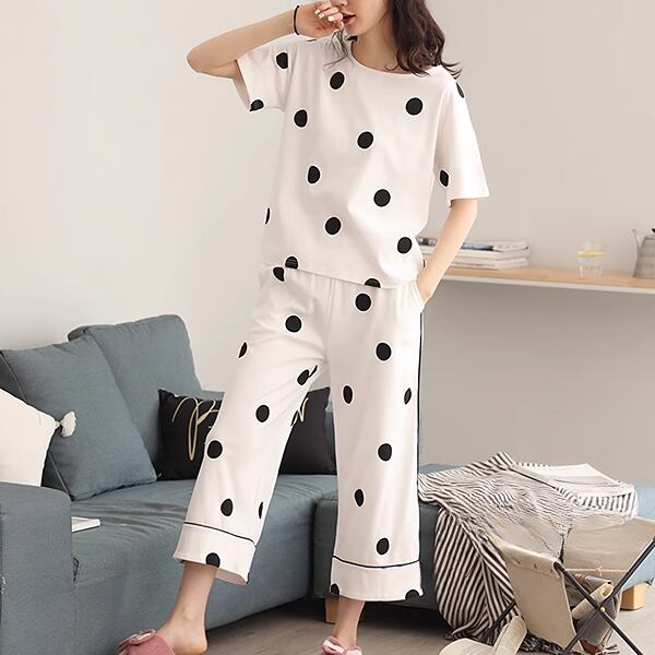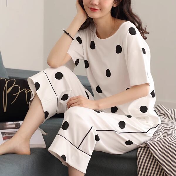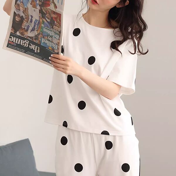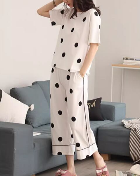 夏女性にぴったり!水玉柄パジャマ。半袖トップスとクロップドパンツの2点セットです。薄手の綿素材で、暑い夏に涼しく快適な睡眠を提供します。韓国風のカジュアルなデザインが特徴。ホームウェアとしてだけでなく、外出用としてもおしゃれなサマースーツ。リラックスしたい夏の夜や、快適な休日に最適なアイテムとしてオススメです。