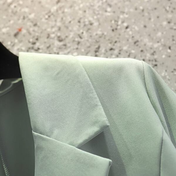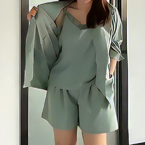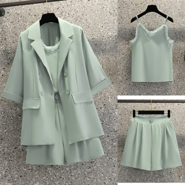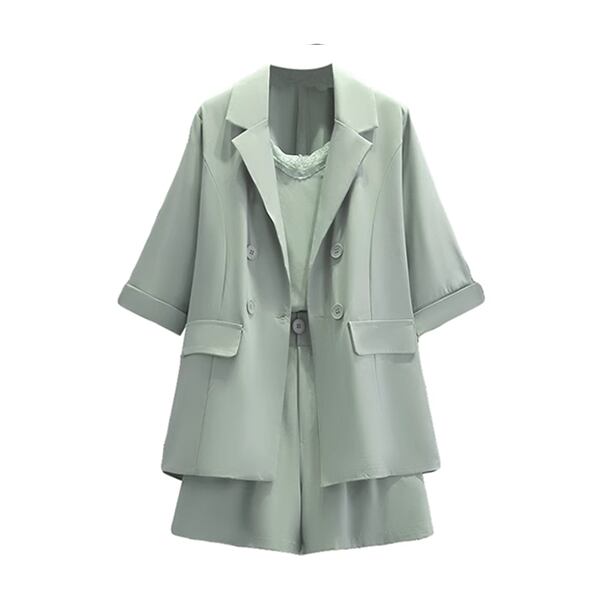 ジャケット、サスペンダーショーツ、そしてパンツがセットになったスリーピーススーツ。スマートなシルエットとモダンなデザインで、ビジネスミーティングから特別なイベントまで幅広いシーンで活躍します。、着こなしにユニークなアクセントとなるサスペンダーショーツ付き。洗練されたスタイルと快適さを求める女性におすすめの一着です。
