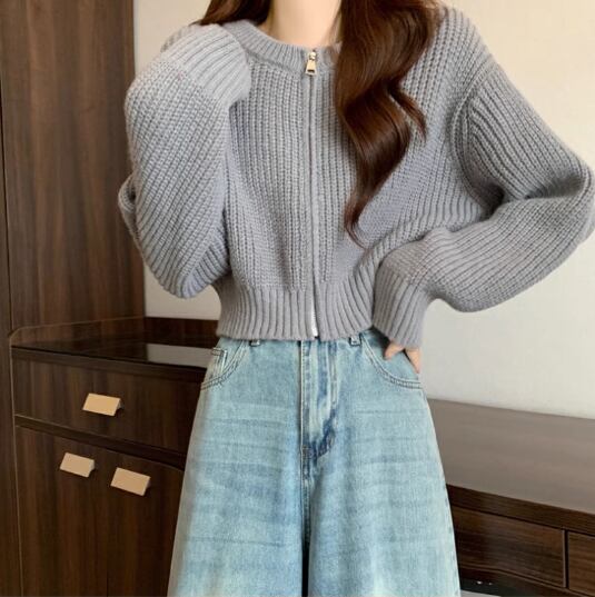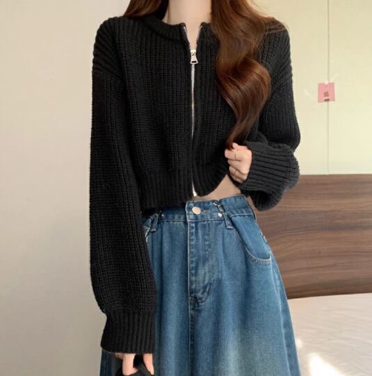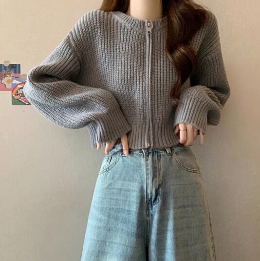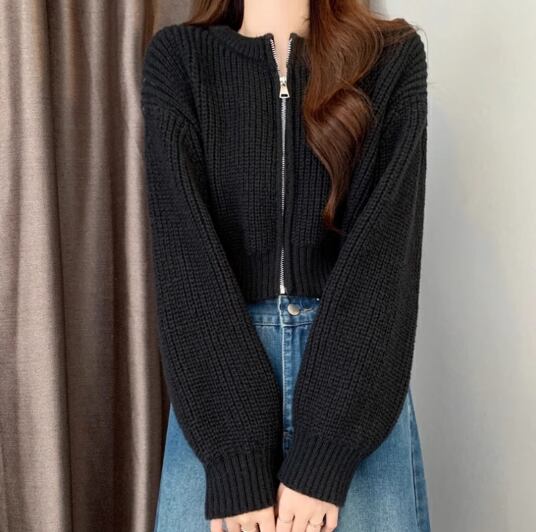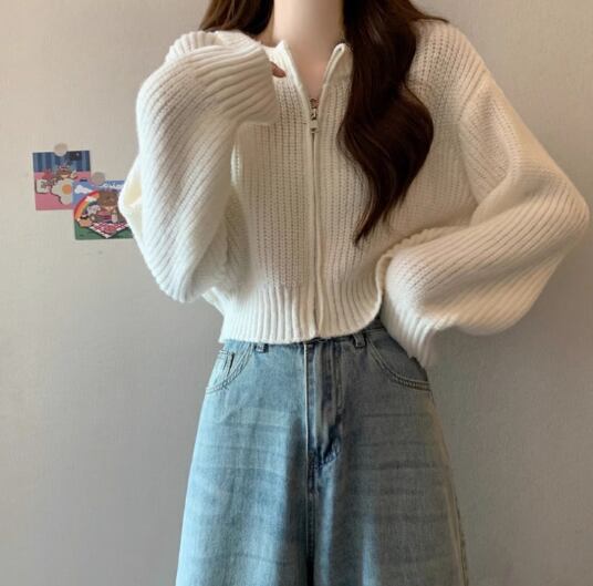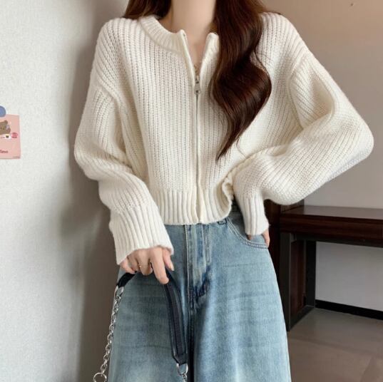 レディース トップス ニット セーター カーディガン 前開き ショート 長袖 ドロップショルダー 細身 ファスナー リブ 前開き ニット かわいい シンプル 上品 ラフ ガーリー ベーシック 優しい 無地 春 秋 冬 お出かけ 女子会 楽ちん 暖かい 防寒 普段使い 動きやすい S M L ホワイト ブラック グレー ベージュ