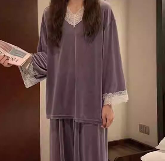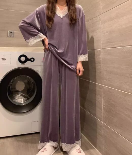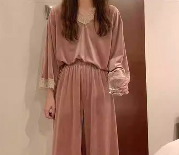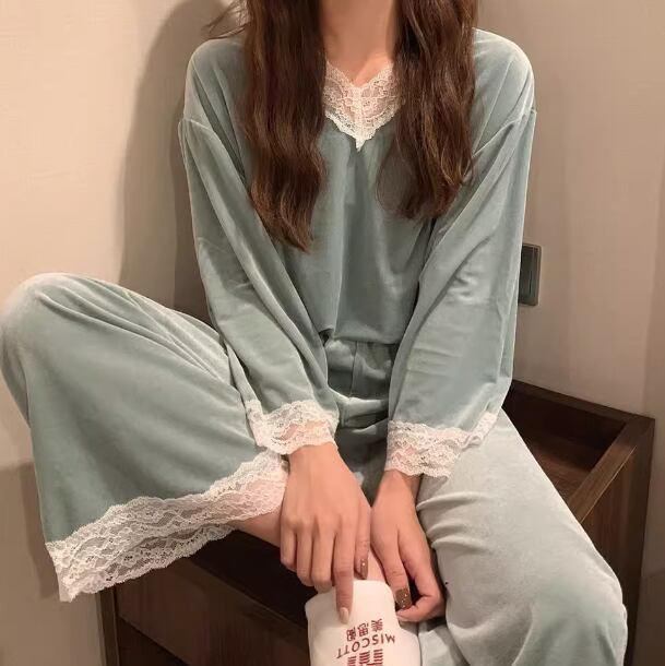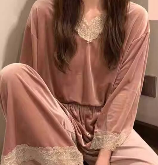 二点セット 上下セット ツーピース レディース プルオーバー セットアップ フルレングス 長袖 Vネック フェミニン レース ウエストゴム ベルベット かわいい 大人可愛い きれいめ シンプル カジュアル 上品 おしゃれ レトロ ラフ ガーリー エレガント キュート ナチュラル リラックス シック 高級感 無地 春 秋 冬 お泊まり 韓国 普段使い 清楚 M L XL 大きいサイズ ピンク ブルー グリーン パープル