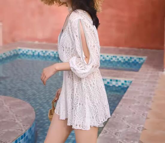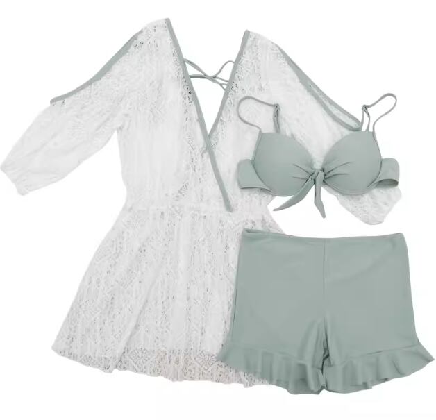 水着 ビキニ レディース 体型カバー ショートパンツ 短パン セパレート Vネック 七分袖 カシュクール リボン フリル バックリボン ハイウエスト 背中開き バックレス 透かし編み セット スリーピース 上下セット かわいい 大人可愛い シンプル カジュアル 華やか 大人っぽい おしゃれ お洒落 ガーリー 無地 リゾート 旅行 温泉 プール 夏 海 着痩せ スタイルアップ 韓国 背中見せ 日除け スタイルカバー こなれ感 お腹カバー M L XL Aカップ Bカップ Cカップ イエロー グレー
