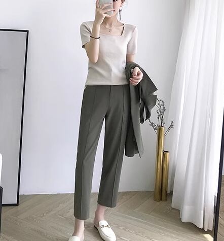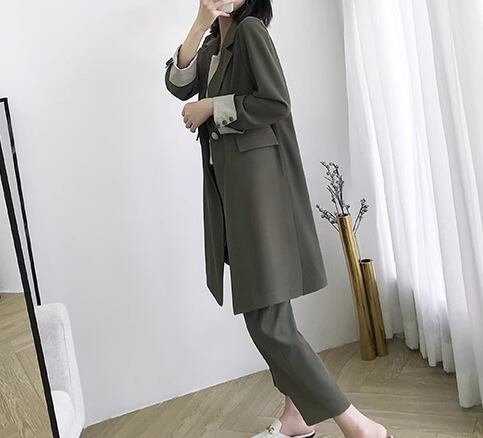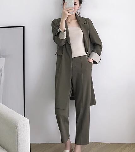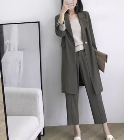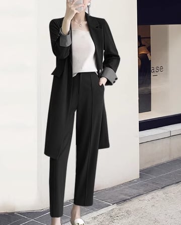 ミドル丈の長袖ジャケットとくるぶし丈のストレートパンツの二点セットです。