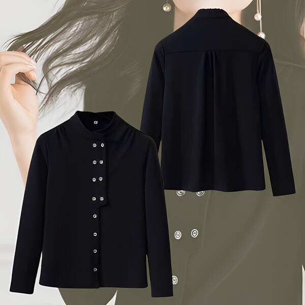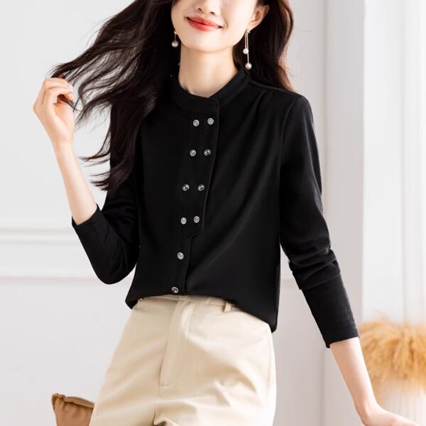 ダブルブレスト/ニッチデザイン/ボトリングシャツ レディース トップス シャツ ブラウス 長袖 スタンドカラー ストレート フォーマル フェミニン プリーツ ボタン カシュクール 大人可愛い シンプル 上品 おしゃれ レトロ ガーリー モード系 エレガント フォーマル 清潔感 オフィスカジュアル 無地 春 秋 プレゼン 20代 30代 オフィス 通勤 イベント ショッピング 運転中 黒 ブラック