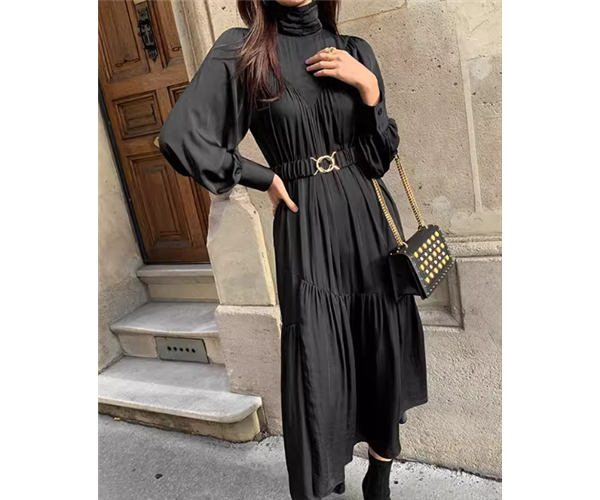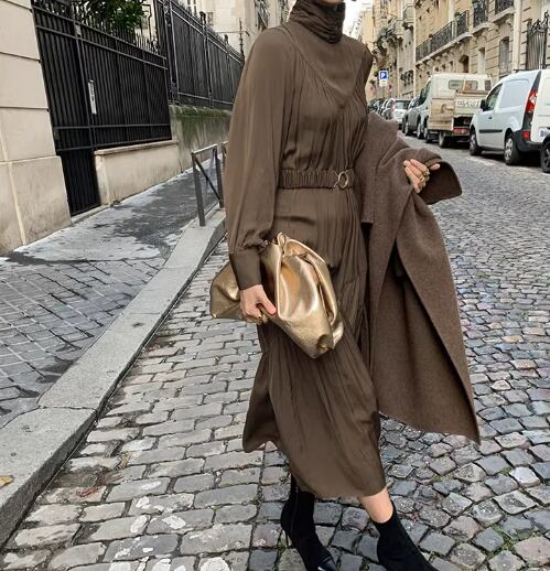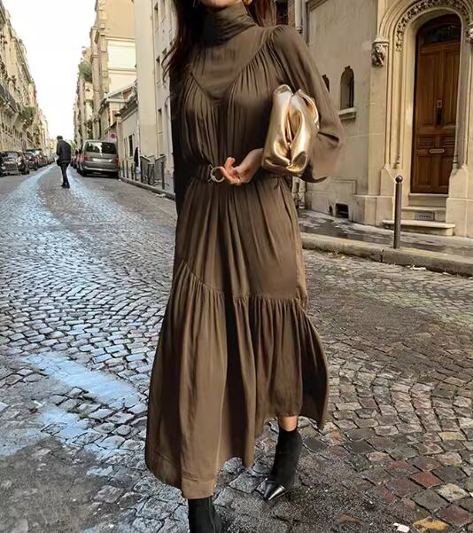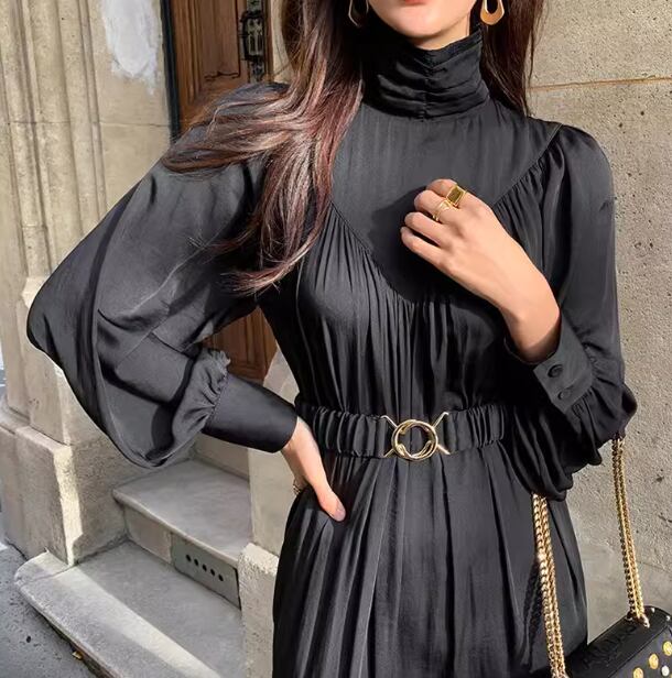 レディース ワンピース プルオーバー ロング 長袖 パフスリーブ ハイネック フェミニン プリーツ ベルト ウエストマーク ハイウエスト 大人可愛い きれいめ シンプル カジュアル 上品 おしゃれ かっこいい レトロ こなれ感 ガーリー ルーズ 個性的 クール エレガント ラグジュアリー クラシカル シック 高級感 スタイリッシュ 無地 秋 デート お出かけ 韓国 体型カバー 普段使い 清楚 S M L ゆったり ブラック ブラウン