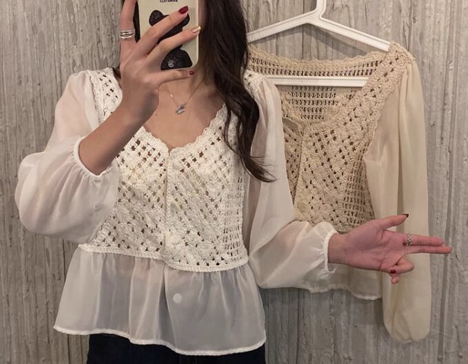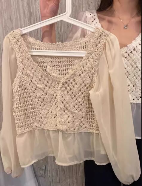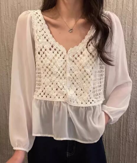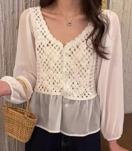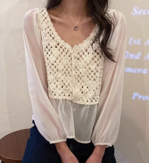 シフォン素材を使用した柔らかくて女性らしいシャツと、Vネックのノースリーブ風の透かし編みデザインが上品で大人可愛いアイテムです。