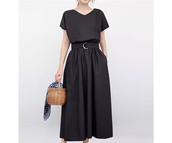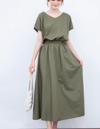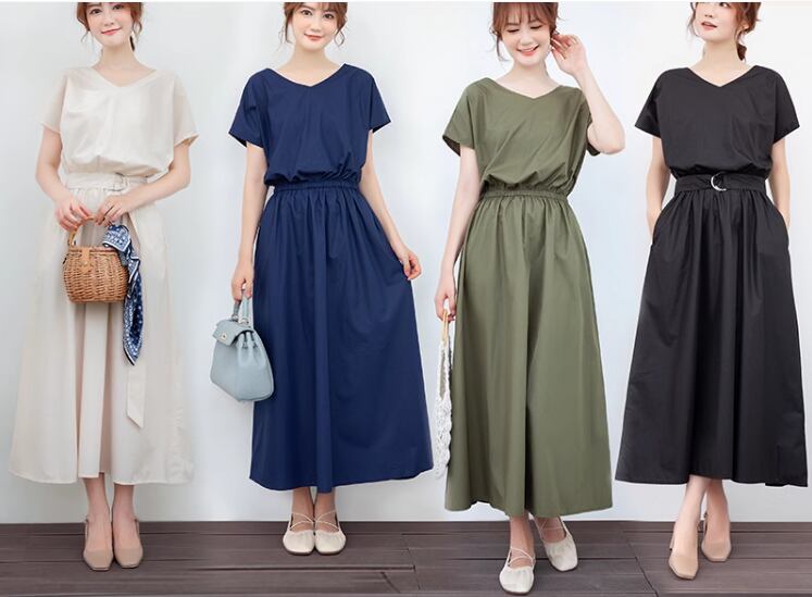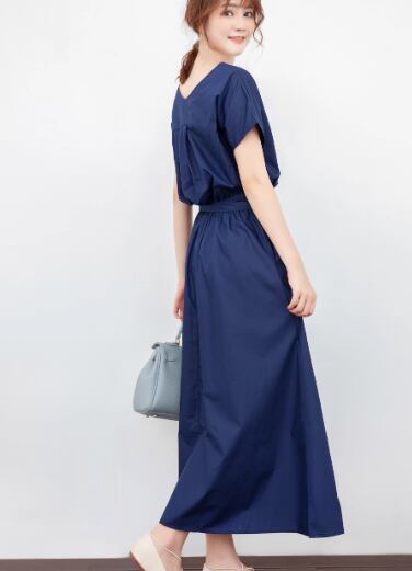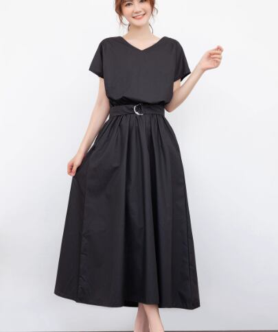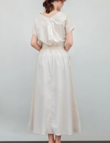 上品で落ち着いた色味とシンプルで洗練されたデザインが大人可愛い半袖のロング丈ワンピース。