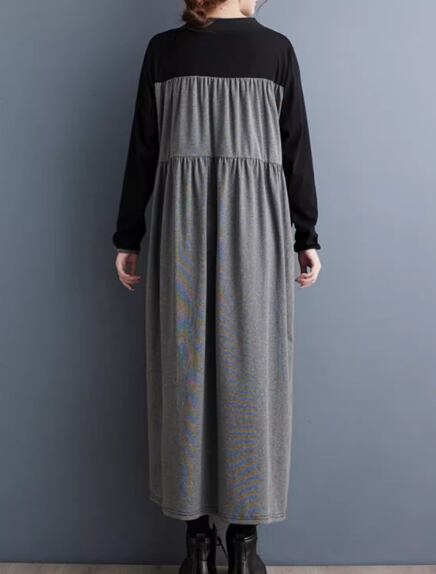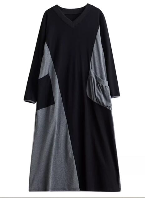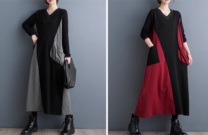 レディース ワンピース プルオーバー ミモレ ロング アシンメトリー 左右非対称 長袖 Vネック Aライン ポケット 切り替えデザイン バイカラー 大人可愛い シンプル カジュアル おしゃれ かっこいい レトロ ラフ ガーリー ルーズ 個性的 クール 存在感 ラグジュアリー ナチュラル リラックス シック 高級感 芸術的 アーティスティック スタイリッシュ 春 秋 デート お出かけ 体型カバー 普段使い ゆったり ゆる フリーサイズ 大きめ ゆったりウエスト グレー レッド