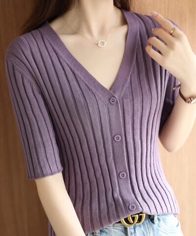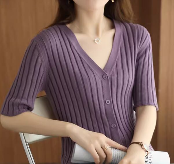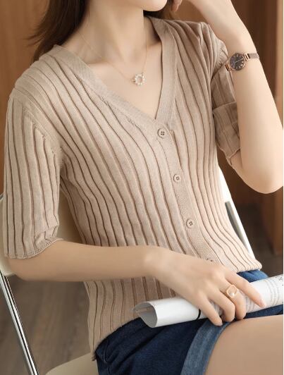 上品で落ち着いたカラーとスマートなシルエットが魅力的な半袖のVネックカーディガン。