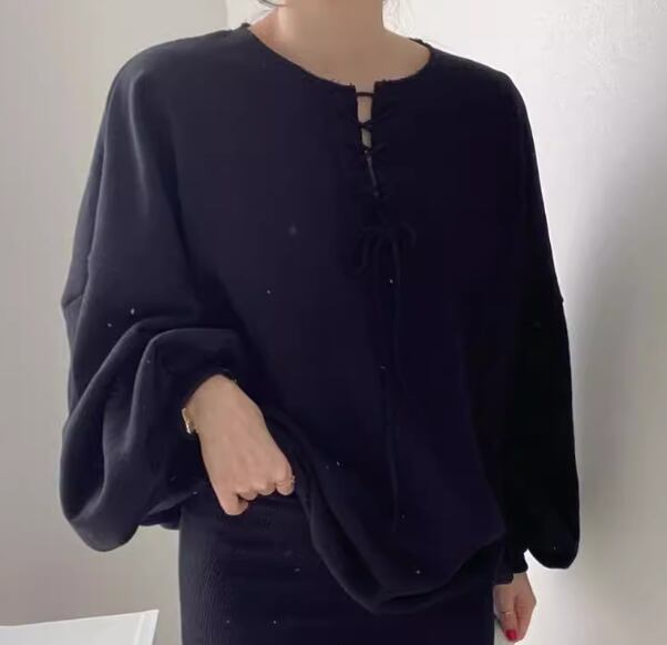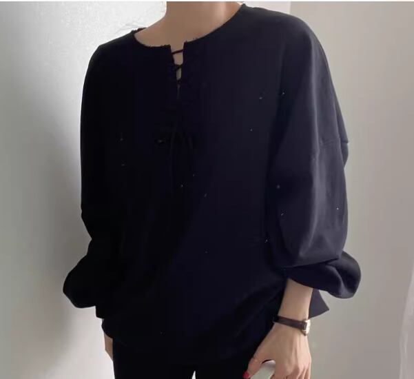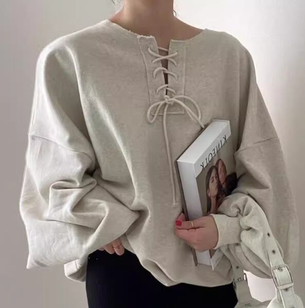 レディース トップス プルオーバー トレーナー ミドル丈 長袖 ボリューム袖 ドロップショルダー バルーン袖 ランタンスリーブ ラウンドネック 編み上げ レースアップ かわいい 大人可愛い シンプル カジュアル 上品 おしゃれ レトロ ラフ ガーリー ルーズ 個性的 エレガント キュート ナチュラル シック 高級感 優しい 穏やか 無地 秋 デート お出かけ 韓国 普段使い 着回し トレンド 流行 ゆったり ゆる フリーサイズ 大きめ オーバーサイズ ブラック グレー