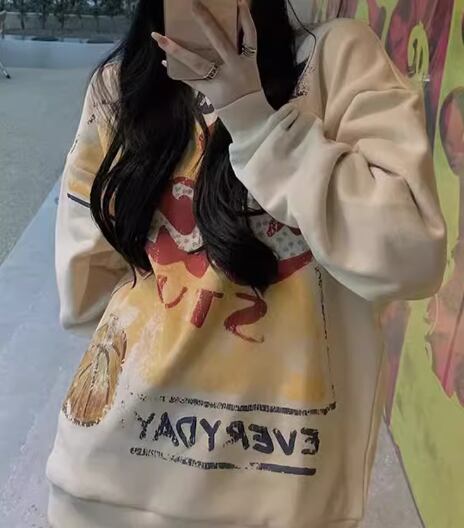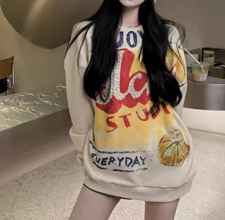 レディース トップス プルオーバー トレーナー スウェット ミドル丈 長袖 ドロップショルダー ラウンドネック ストリート ヒップホップ 薄手 かわいい カジュアル おしゃれ かっこいい レトロ ラフ ボーイッシュ ルーズ 個性的 クール 存在感 キュート ラグジュアリー アメリカン アクティブ リラックス ハンサム 高級感 芸術的 アーティスティック プリント 秋 10代 20代 学生 デート お出かけ 体型カバー 普段使い 着回し トレンド 流行 M L ゆったり アプリコット