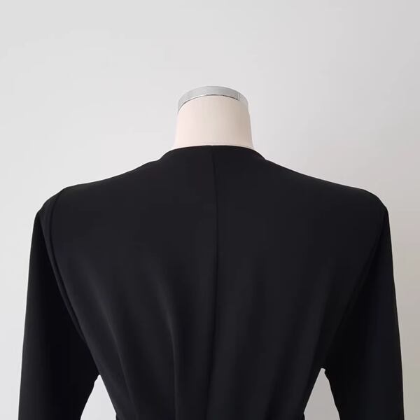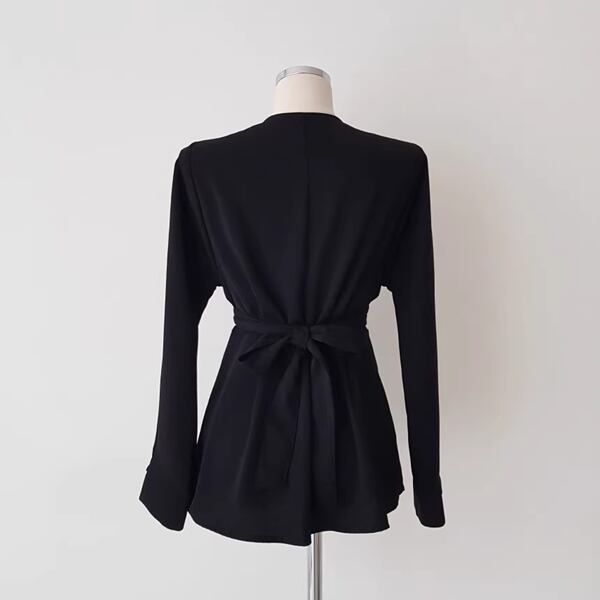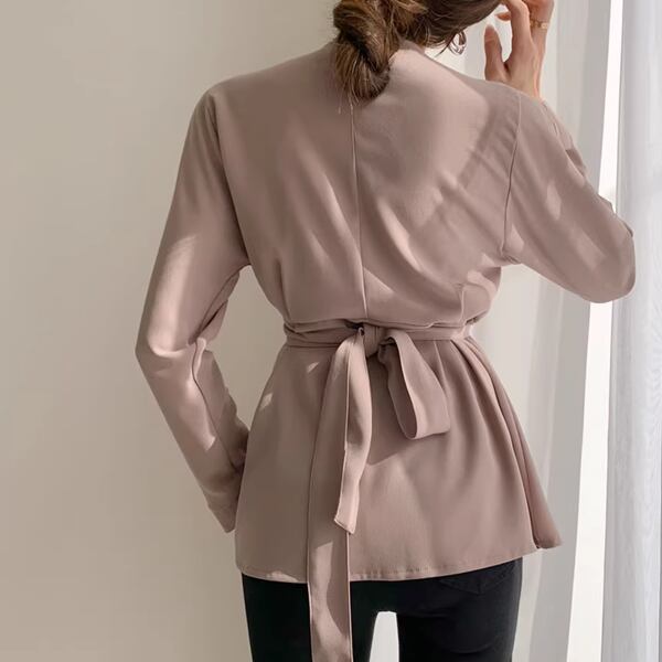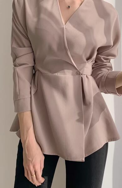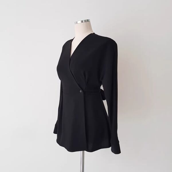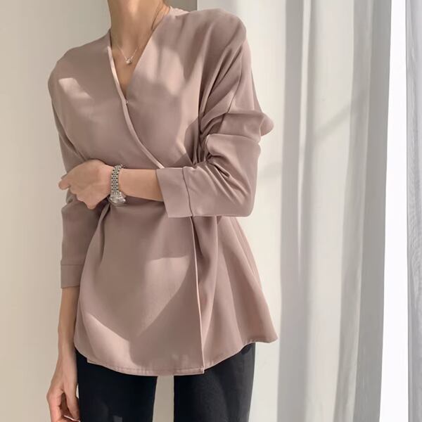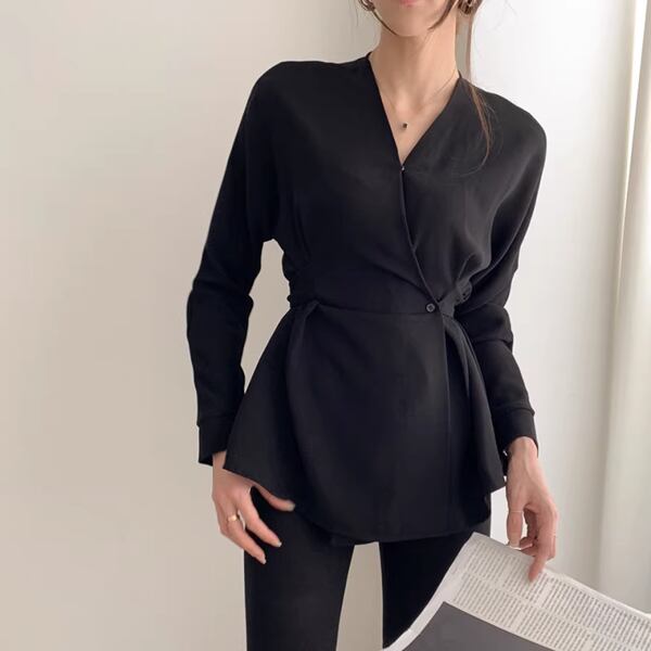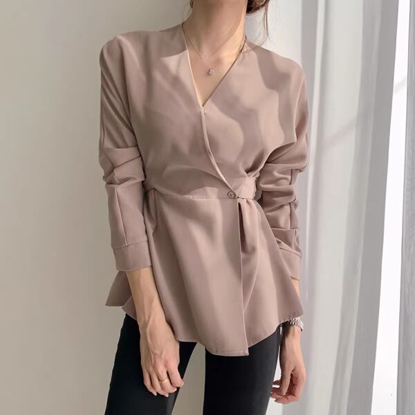 韓国のファッションからインスパイアされた、シックでニッチなレトロデザインのVネック長袖シャツ。ウエストを程よく引き締めるストラップウエストがポイントです。無地のソリッドカラーがスタイリッシュで、スリムフィットのシルエットが魅力。日常のオフィススタイルやカジュアルな外出先で活躍する一着です。