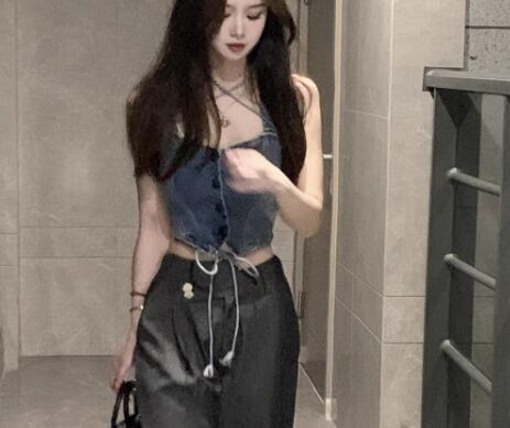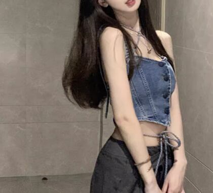 クロスストラップと短めの丈感がおしゃれなデニム生地のノースリーブトップス。