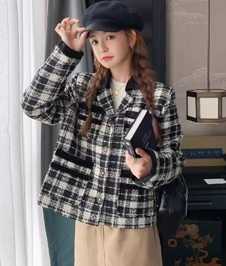 モノトーンのチェック柄がレトロで大人可愛いショート丈のキルティングジャケット。