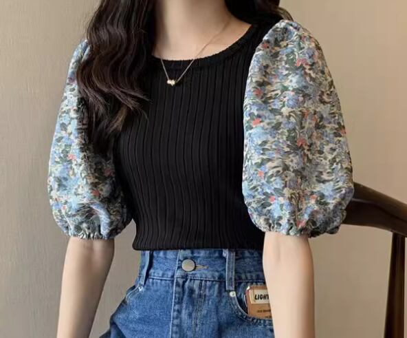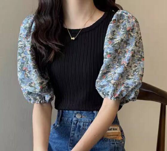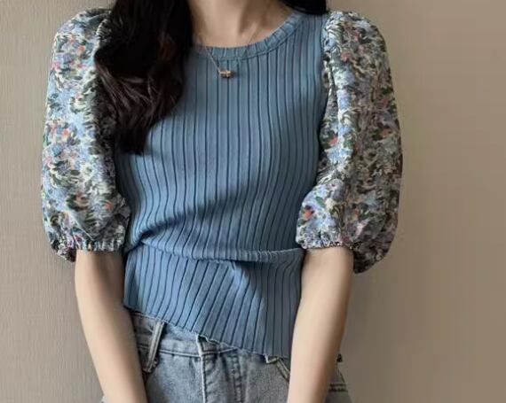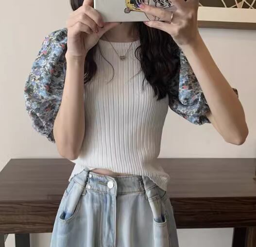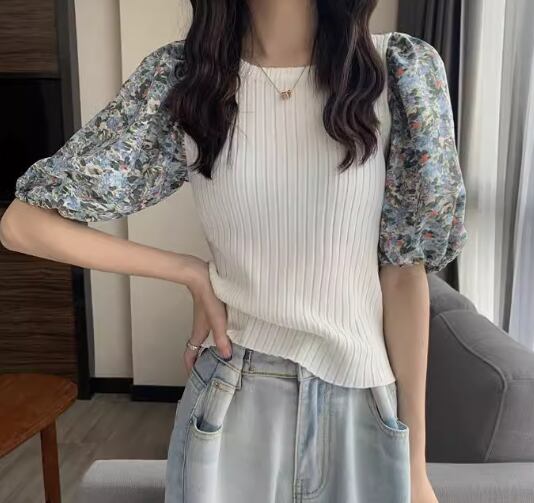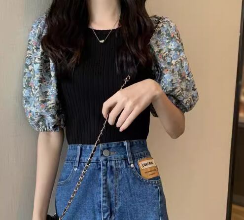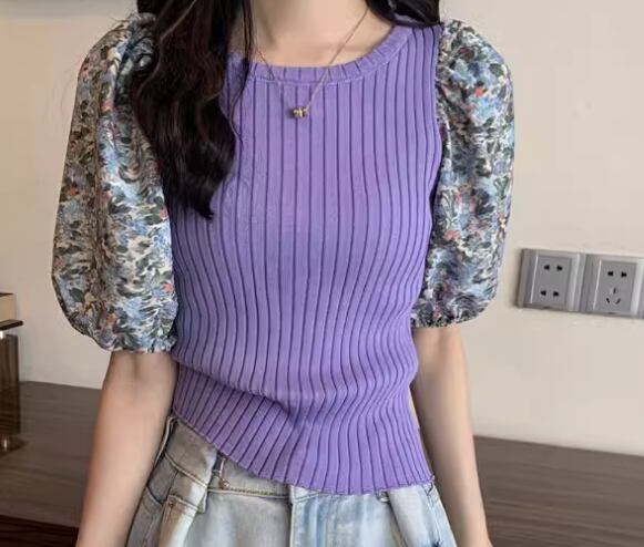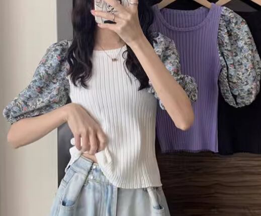 レディース トップス カットソー ニット プルオーバー Tシャツ ショート クロップド丈 半袖 ボリューム袖 パフスリーブ ラウンドネック スリム 細身 フェミニン 切り替えデザイン ドッキング かわいい 大人可愛い きれいめ カジュアル 上品 おしゃれ ラフ ガーリー 個性的 エレガント 存在感 キュート ラグジュアリー 無地 花柄 フラワー 夏 デート お出かけ 普段使い 着回し 清楚 フリーサイズ 小さめ ホワイト ブラック ブルー パープル
