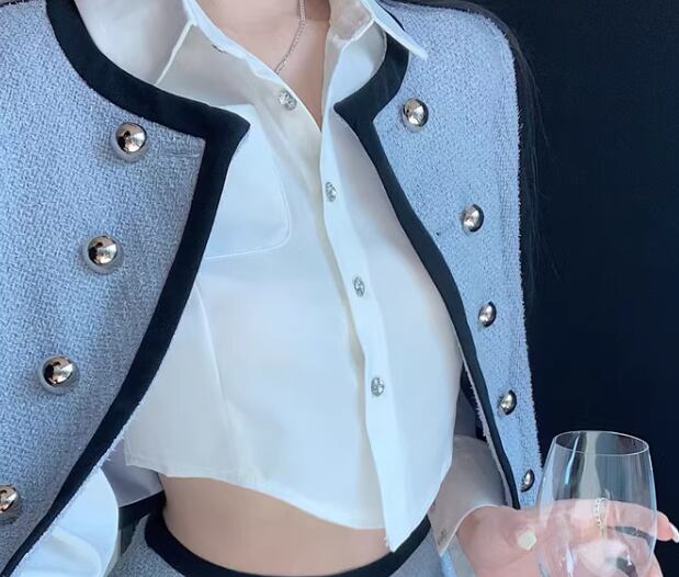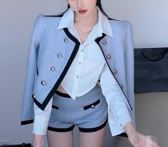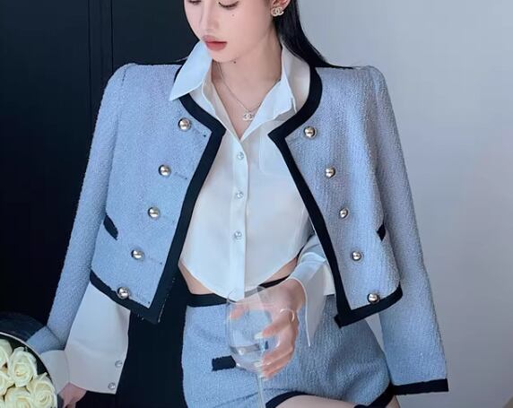 レディース ジャケット スーツ アウター 上着 羽織 前開き ショート クロップド丈 長袖 ラウンドネック 襟なし ノーカラー フェミニン ボタン かわいい 大人可愛い きれいめ カジュアル 上品 おしゃれ かっこいい こなれ感 個性的 クール エレガント 抜け感 ラグジュアリー ハンサム シック 高級感 スタイリッシュ 無地 秋 ビジネス OL 通勤 デート お出かけ 普段使い 着回し S M L ブルー