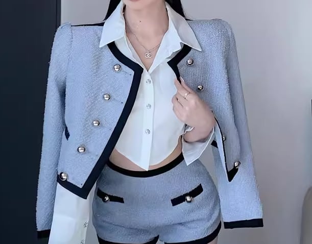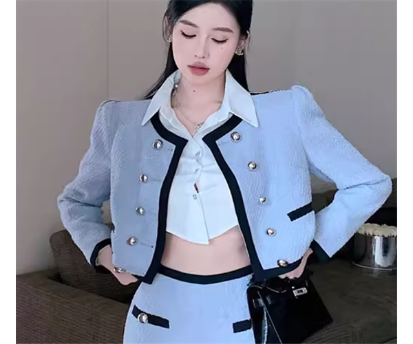 爽やかなブルーの色味が魅力的なショート丈のノーカラージャケット。