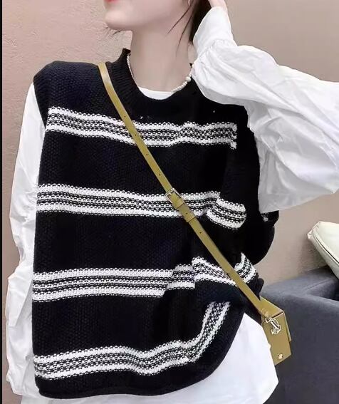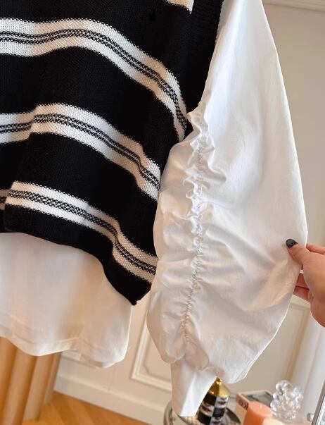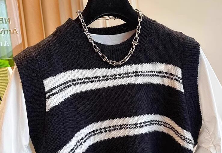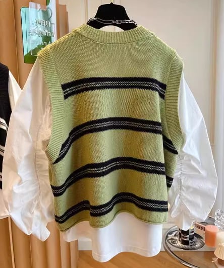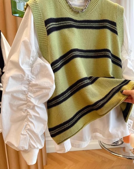 プルオーバータイプの無地の白シャツとボーダーが特徴的なノースリーブのニットベストの二点セット。