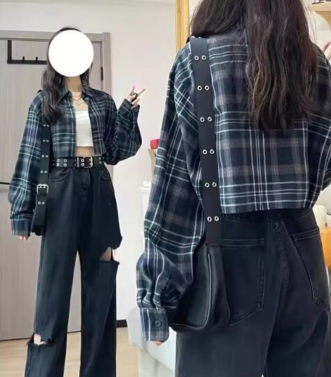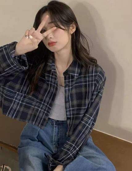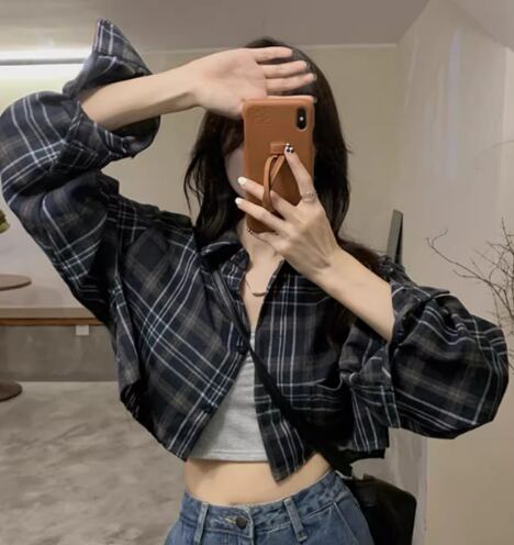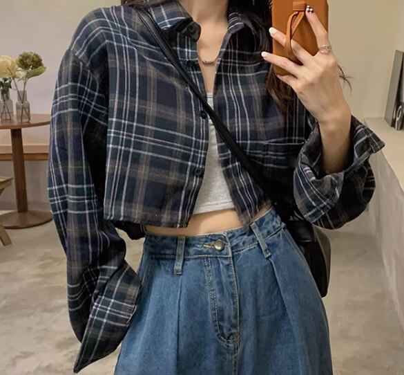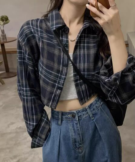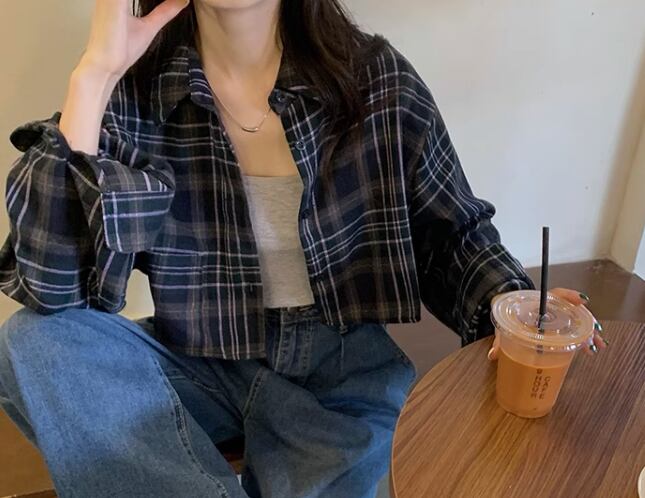 レディース トップス シャツ 羽織 ショート クロップド丈 長袖 襟付き ポロカラー 前開き ボタン 薄手 かわいい 大人可愛い カジュアル おしゃれ かっこいい レトロ こなれ感 ボーイッシュ ルーズ クール 抜け感 キュート ラグジュアリー ナチュラル ハンサム シック チェック 春 デート お出かけ 普段使い 着回し トレンド 流行 M L ゆったり ゆる 大きめ オーバーサイズ グリーン