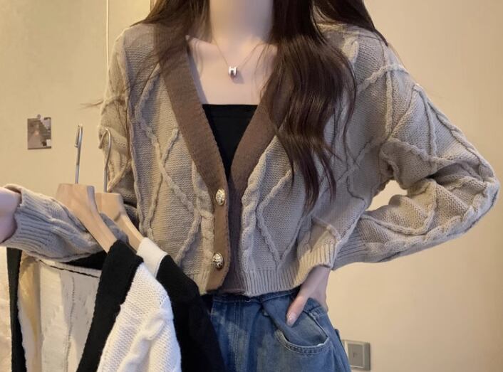 レディース トップス ニット カーディガン ショート クロップド丈 長袖 Vネック ストレート フェミニン ボタン ケーブルニット かわいい 大人可愛い きれいめ シンプル カジュアル 上品 おしゃれ ボーイッシュ ルーズ エレガント 抜け感 キュート ラグジュアリー ナチュラル シック 高級感 春 デート お出かけ 重ね着 普段使い 着回し レイヤード トレンド 流行 ゆったり ゆる フリーサイズ 大きめ オーバーサイズ ブラック オフホワイト カーキ