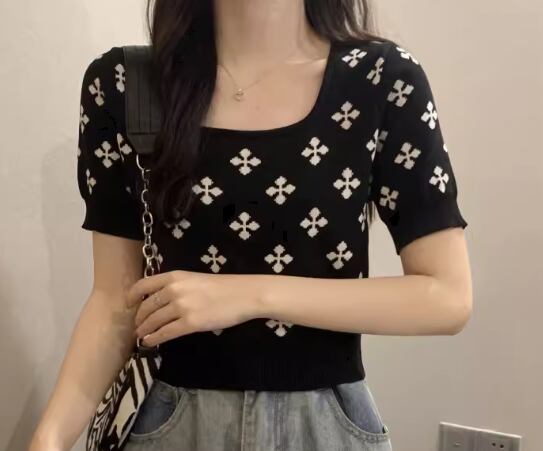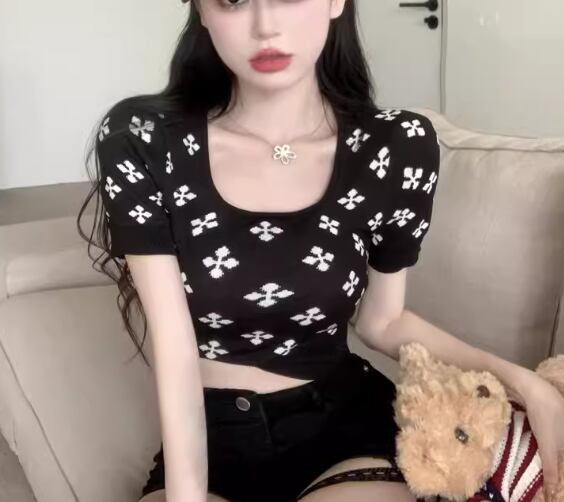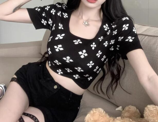 クロップド丈と大人可愛い模様が魅力的な半袖トップスとブラックのデニムショートパンツの二点セット。