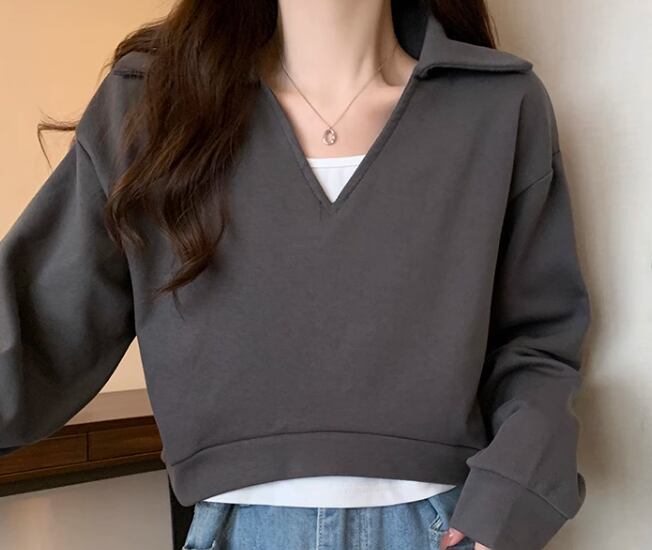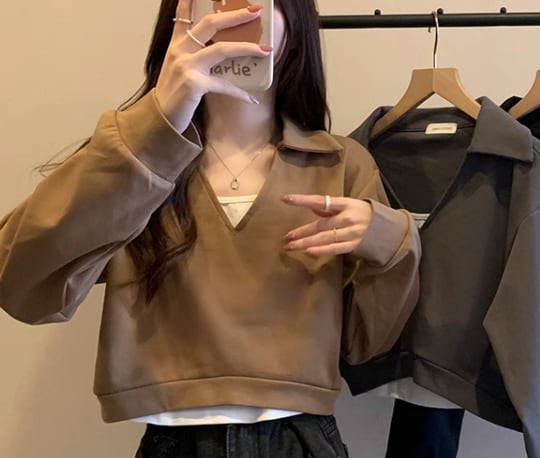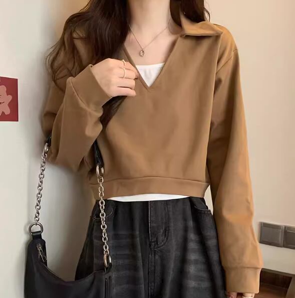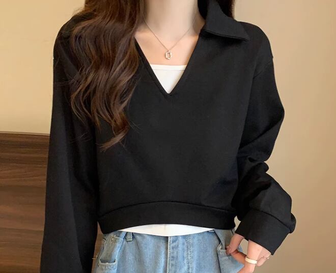 重ね着風 フェイクツーピース トップス ニット セーター プルオーバー ショート 長袖 Vネック 襟付き ポロカラー ドッキング 大人可愛い きれいめ シンプル カジュアル 上品 おしゃれ かっこいい レトロ ボーイッシュ ルーズ クール エレガント 無地 春 デート お出かけ 重ね着 普段使い 着回し レイヤード トレンド 流行 ゆったり ゆる フリーサイズ 大きめ オーバーサイズ ブラック ブラウン カーキ