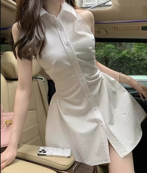 タイトなシルエットと短めの丈がセクシーなノースリーブのシャツワンピース。