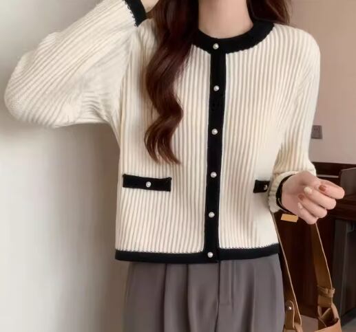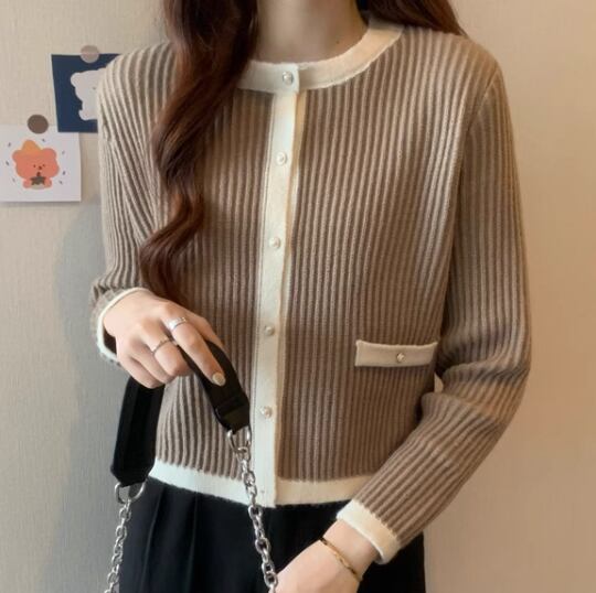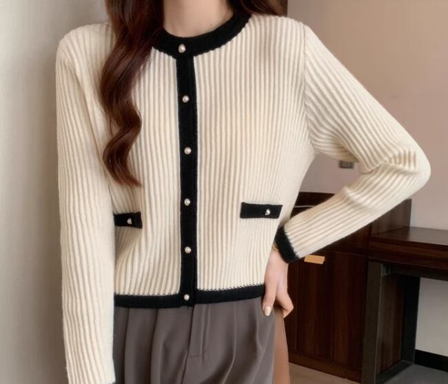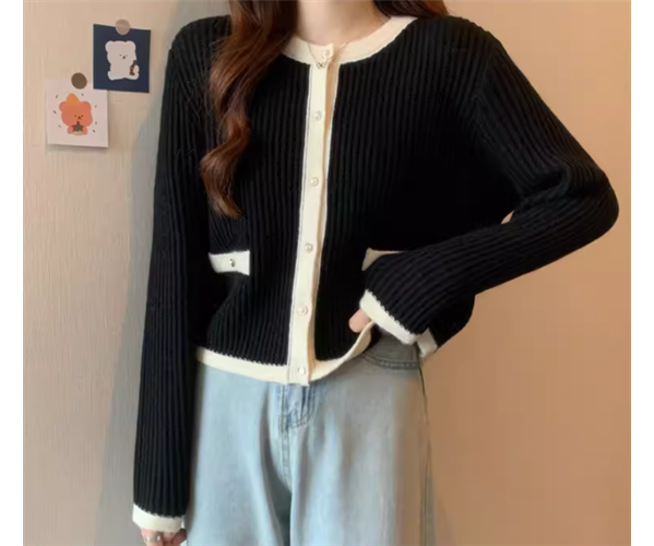 上品でエレガントなデザインとシックなカラーが大人可愛いショート丈のニットカーディガン。