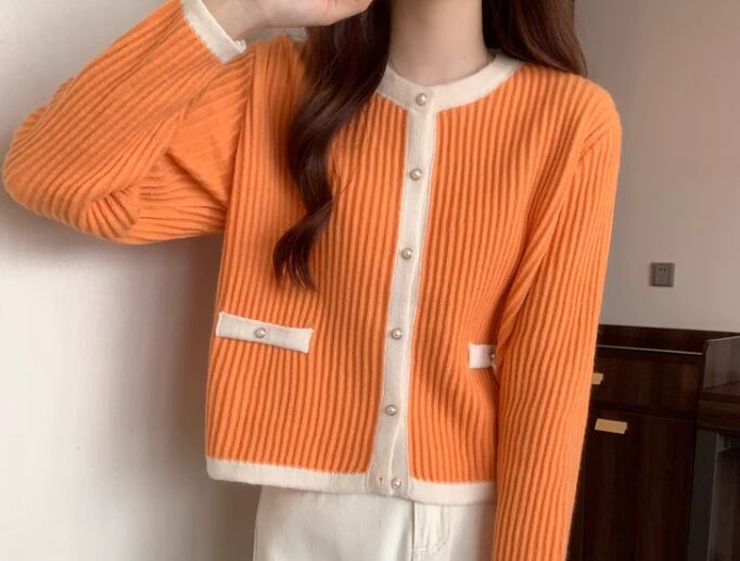 レディース トップス ニット セーター カーディガン ショート 長袖 ラウンドネック 襟なし ノーカラー フェミニン 前開き ボタン かわいい 大人可愛い きれいめ カジュアル 上品 おしゃれ レトロ こなれ感 クール エレガント クラシカル セレブリティ 知的 シック 高級感 無地 秋 冬 デート お出かけ 普段使い 着回し フリーサイズ ブラック カーキ オレンジ アプリコット