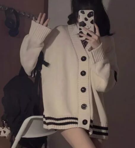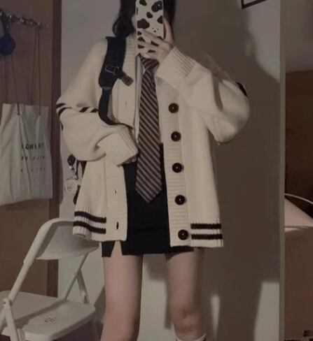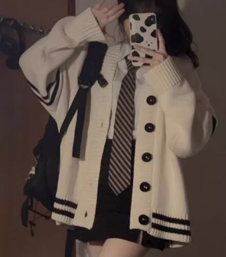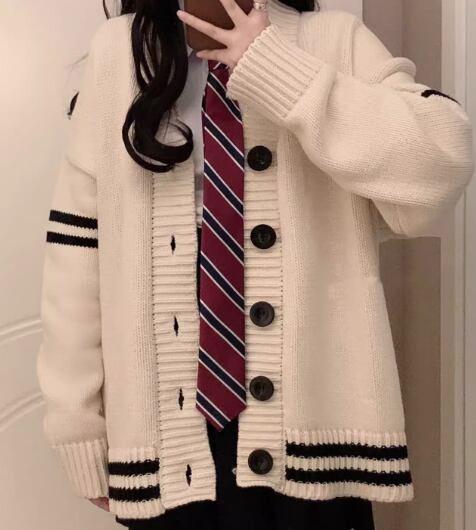 ゆるだぼなオーバーサイズとカレッジ風デザインが可愛い長袖のニットカーディガン。