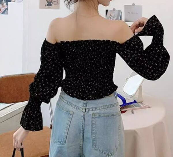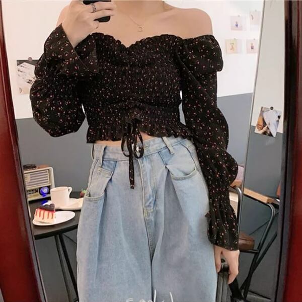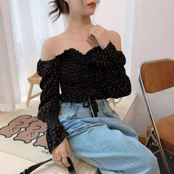 2カラー レディース トップス シャツ ブラウス ショート 長袖 トランペットスリーブ スクエアネック オフショルダー ワンショルダー ストレート ストリート シフォン ドロスト へそ出し 大人可愛い カジュアル 上品 かっこいい ラフ ガーリー ルーズ エレガント 涼しげ 小花柄 春 夏 秋 10代 20代 通勤 イベント リゾート レストラン ガーデン ショッピング ツーリング 普段使い トレンド スタイルアップ