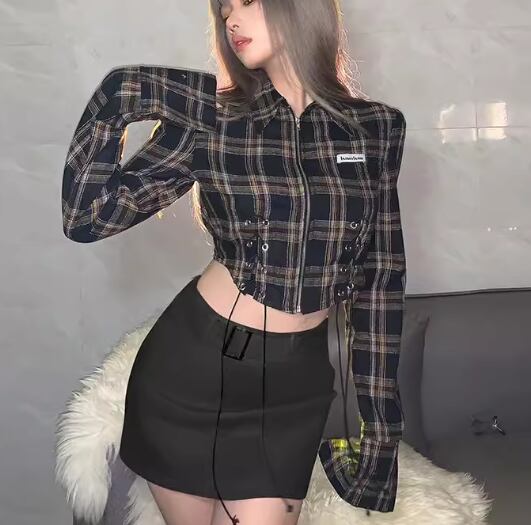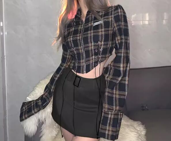 レディース トップス シャツ ショート クロップド丈 長袖 襟付き ポロカラー ファスナー 前開き 編み上げ レースアップ かわいい 大人可愛い カジュアル おしゃれ かっこいい こなれ感 ボーイッシュ 個性的 クール 存在感 抜け感 ラグジュアリー セクシー ハンサム シック 高級感 チェック 春 10代 20代 学生 デート お出かけ 普段使い 着回し トレンド 流行 S M L XL 大きいサイズ ブラック