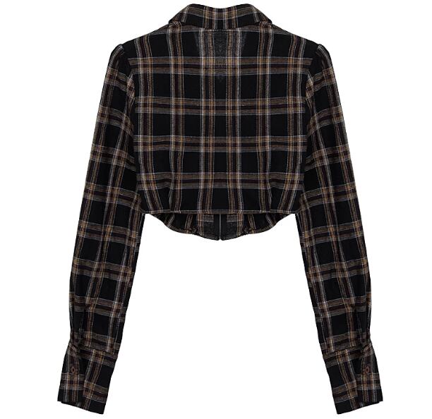 大人可愛い黒のチェック柄とレースアップデザインがかっこいいショート丈の長袖シャツ。