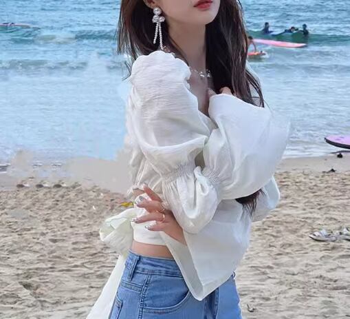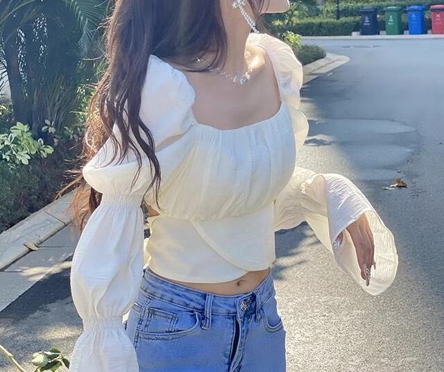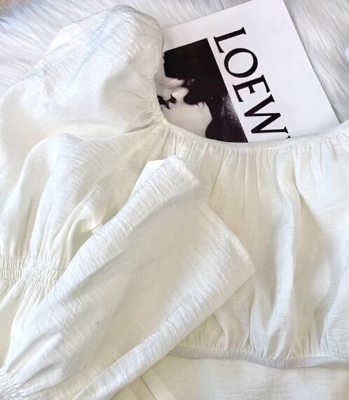 レディース トップス カットソー プルオーバー ショート クロップド丈 長袖 ボリューム袖 パフスリーブ スクエアネック バックリボン かわいい 大人可愛い きれいめ シンプル カジュアル おしゃれ かっこいい こなれ感 ラフ ガーリー 個性的 エレガント 存在感 抜け感 ラブリー キュート ラグジュアリー 無地 春 夏 10代 20代 学生 デート お出かけ 普段使い 着回し トレンド 流行 S M L XL 大きいサイズ ホワイト