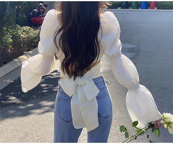 大きめのバックリボンと個性的なデザインの袖が魅力的なクロップド丈の長袖トップス。