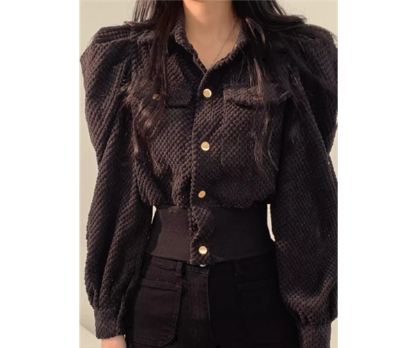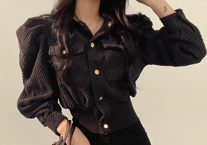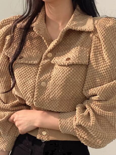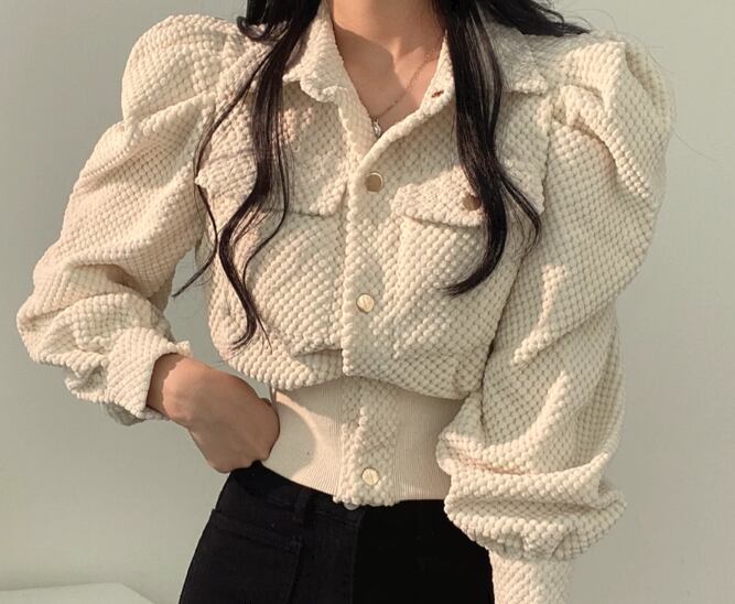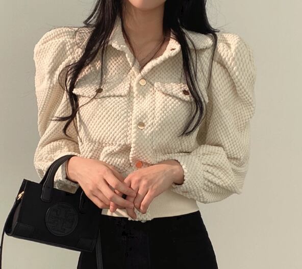レディース トップス シャツ ショート クロップド丈 長袖 ボリューム袖 パフスリーブ 襟付き ポロカラー ストレート フェミニン ポケット 前開き ボタン コーデュロイ かわいい 大人可愛い きれいめ シンプル カジュアル 上品 おしゃれ かっこいい レトロ クール エレガント キュート ラグジュアリー 無地 秋 デート お出かけ 韓国 普段使い 着回し トレンド 流行 S M L XL ブラック カーキ アプリコット
