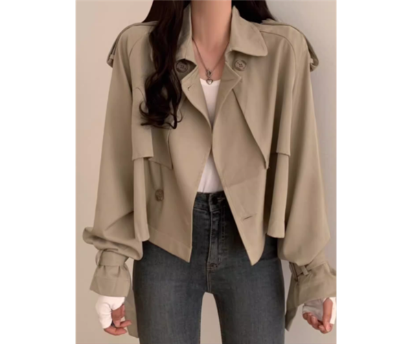 上品で落ち着いた色味と洗練されたスタイリッシュなデザインが大人可愛いショート丈のトレンチコート。